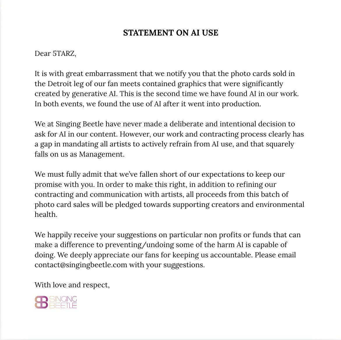 K-POP News 2025-10-28 Singing Beetleは、1VERSEの最近のフォトカードに含まれているGen AIに関して公式声明を発表 Singing Beetleは、1VERSEの最近のフォトカードに含まれているGen AIに関して公式声明を発表 K-POPK-POP NewsKPOPKPOP NewsNEWS Write A Commentコメントを投稿するにはログインしてください。