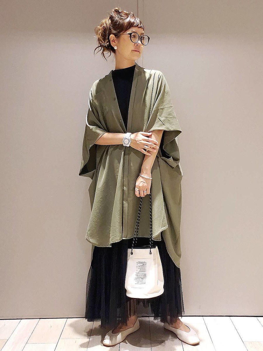 広がりすぎないシルエットの「チュール2WAYレイヤースカート」は、ワンピースとのレイヤードも楽しめます。たっぷりとボリュームのあるチュニックワンピを合わせれば、こなれた雰囲気のカジュアルコーデに。カーキと黒の落ち着いた配色で、大人っぽいコーデに仕上がります。重たく見えないよう、足元には白のシューズを投入するのが◎