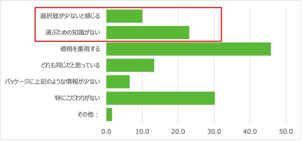 また、乳製品の購入時に産地や生産方法などを「意識しない」と回答した人にその理由を尋ねたところ、「価格を重視する」が45.8%と最も高く、次いで「選ぶための知識がない」が23.1%、「選択肢が少ないと感じる」が10.1%、という結果となり、そもそも乳製品を「選ぶ」という考えやシーンに出会っていない消費者が多くいる可能性も示唆された。