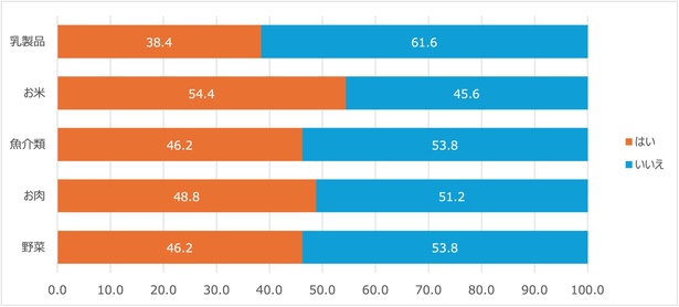 食品の購入時に産地や栽培方法を「意識する」と答えた人が、お米では54.4%、野菜では46.2%、お肉では48.8%、魚介類では46.2%だったなか、牛乳やバターなどの乳製品を購入する際に、産地や生産方法、生産者のこだわりを「意識する」と答えた人は38.4%にとどまり、他の食品と比較して意識が低いことが判明。