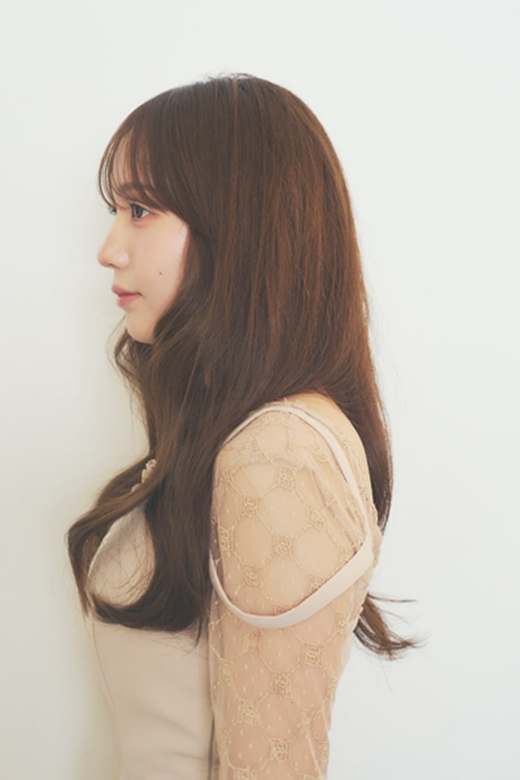 バランスをとるため前髪はシースルーバングで抜け感を。