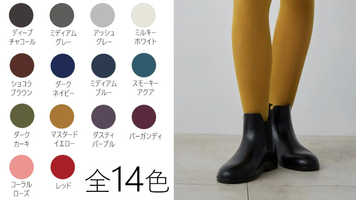 「80デニールカラータイツ」は、マットな質感と程よい厚みでしっかり発色。遊び心と上品さのあるカラーバリエーションで、普段のコーディネートのアレンジから脚もとが主役のコーディネートまで自由自在となっている。