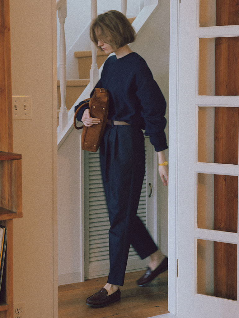 【POINT】タックパンツとオーセンティックなネイビーでまとめて、お仕事にも向く硬派なスタイルへとアップグレード。ハンサムなブラウン小物でクラス感をアップ。