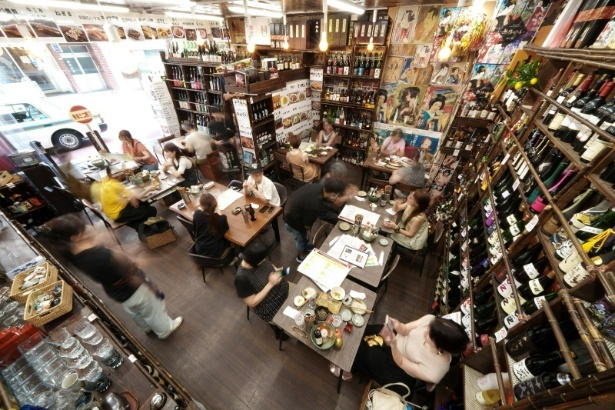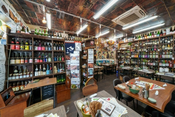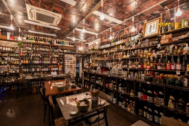 3メートル近い壁面には、日本酒をはじめ焼酎、ウイスキー、テキーラ、シャンパン、ワイン、リキュールなどが天井までぎっしりと並ぶ。そのなかには、拳銃型や消火器型のユニークなボトルや幻の酒・アブサンなど、コレクター心をくすぐる品も多い。