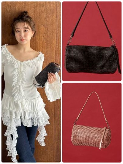 キラキラと輝くビジューを全面にあしらったミニバッグは、特別な日のドレッシーなコーデはもちろんデイリーコーデのワンポイントとしても活躍。見た目に反して、軽いので使い勝手抜群なんです。