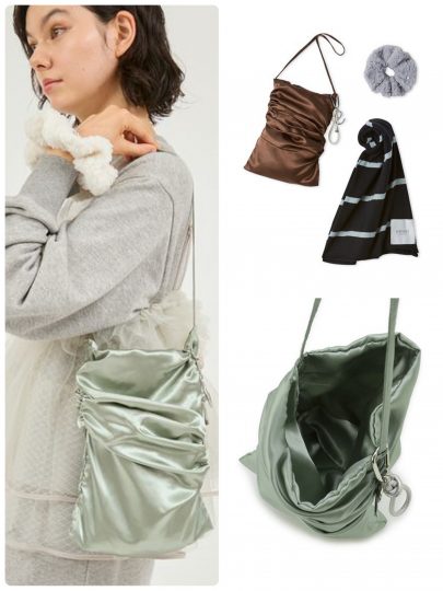 トラベルシーズンに向けて、お得すぎるギフトセットが到着しました。旅先での外出に便利なミニバッグ、シュシュ、バッグをかわいくアレンジするチャーム、冷暖房対策にもってこいなブランケットの4点セットは、自分用としてはもちろんクリスマスのギフトに選びたいスペシャル感。バッグはくしゅっとギャザーをきかせたフォルムと繊細なストラップがポイントです。