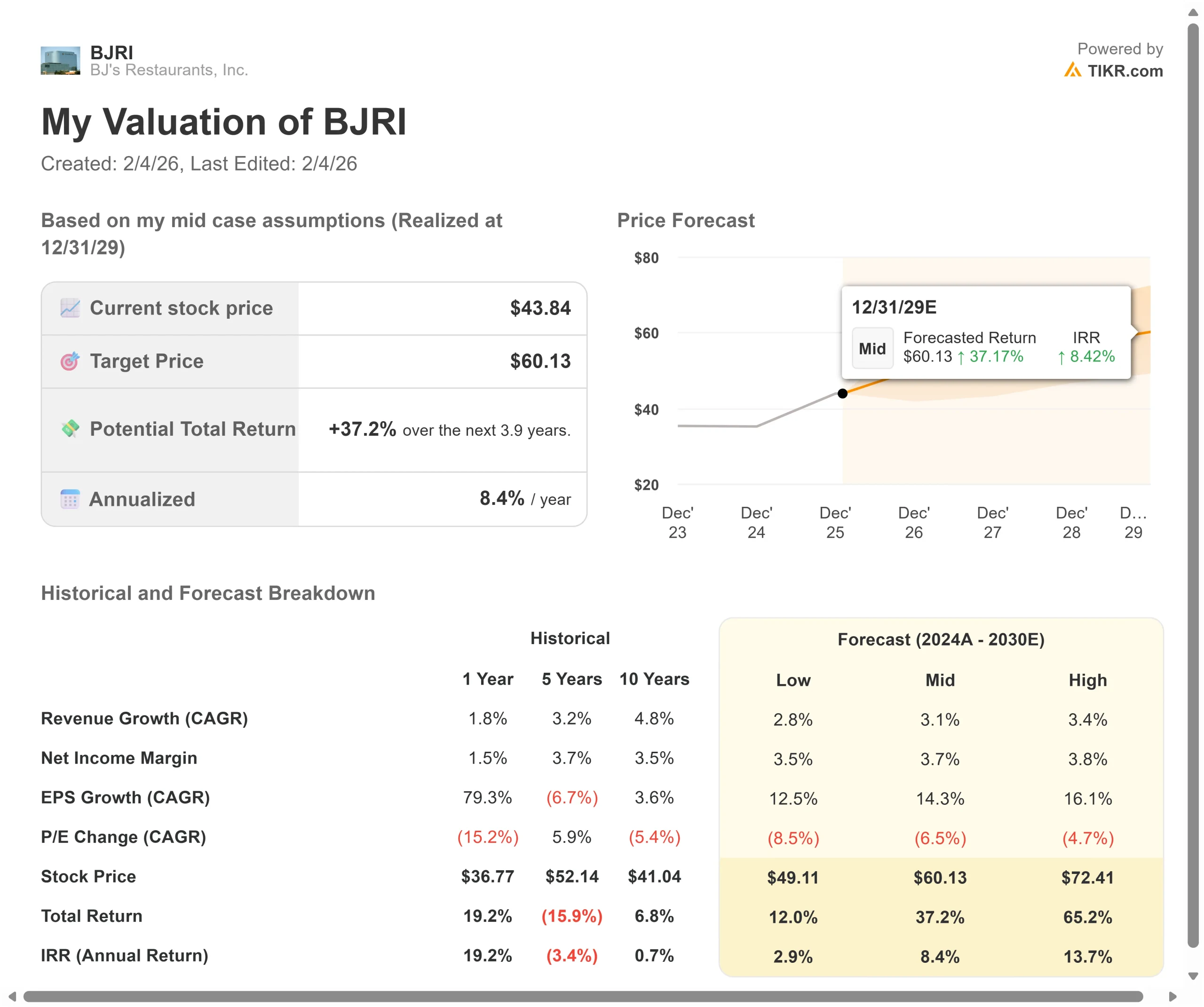 BJRI 株式評価モデル(TIKR)