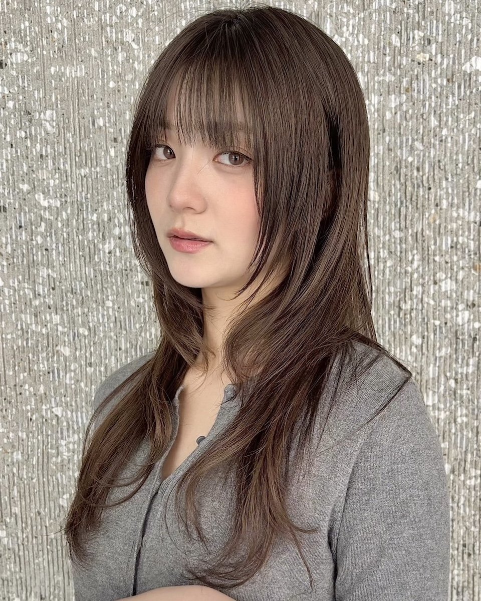【3】ワイドバングで目元くっきり!ツヤ感ヘアカラーのローレイヤーロング