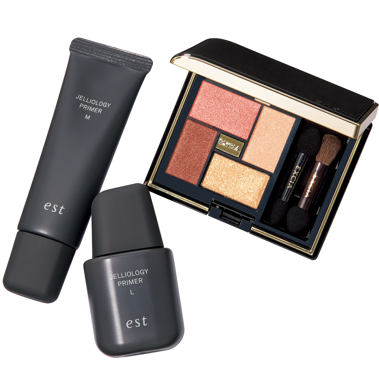 左・【エスト】エスト ジェリオロジー プライマー M 25g¥4,950 L 25ml ¥4,950(ともにエスト)右・【エクシア】アイカラー ヴォロンテ  02 ¥6,600(アルビオン)