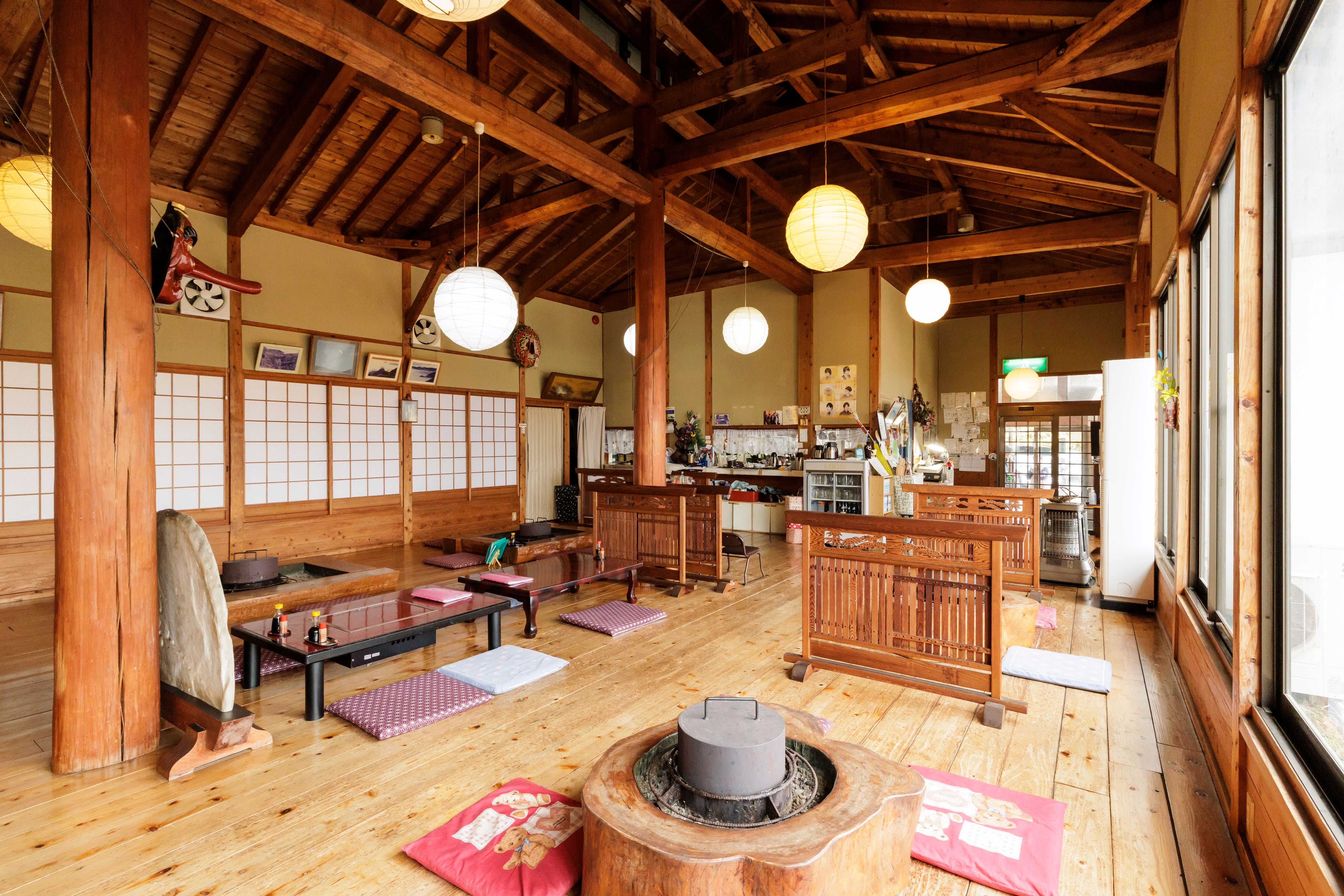 店舗は天井が高く開放的で、梁(はり)の見える木造。家庭的な雰囲気の中、落ち着いてくつろげます。丸いいろりのテーブルは勝康さんと先代がケヤキをくり抜いて手作りした代物です。