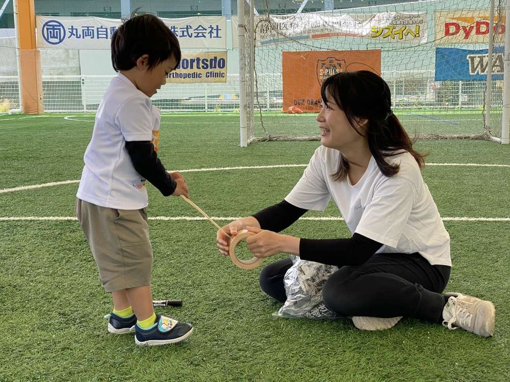 親子で新聞紙を丸めてサッカーボール作りにチャレンジします。手先を使ってモノを作る「工作」は子どもの成長には欠かせない重要な要素の1つとなります。工作を取り入れることで子供たちの好奇心に刺激を与え、集中力を高めます。