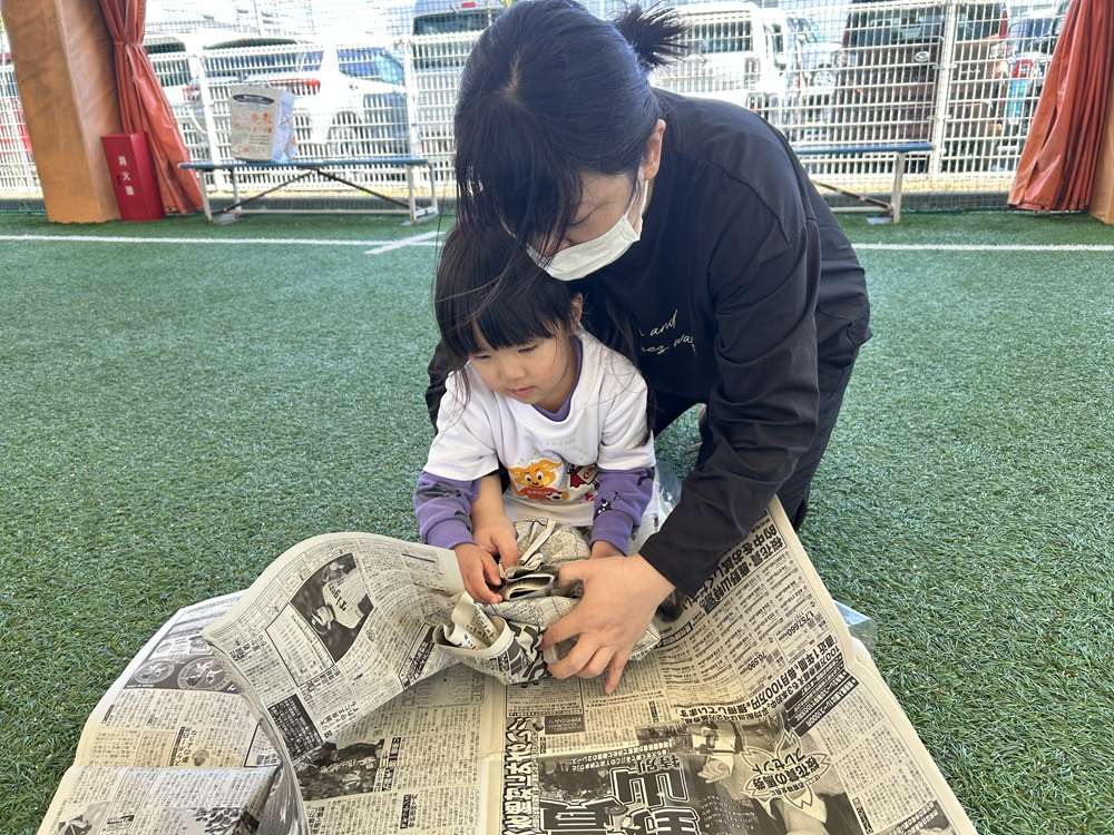 親子で新聞紙を丸めてサッカーボール作りにチャレンジします。手先を使ってモノを作る「工作」は子どもの成長には欠かせない重要な要素の1つとなります。工作を取り入れることで子供たちの好奇心に刺激を与え、集中力を高めます。