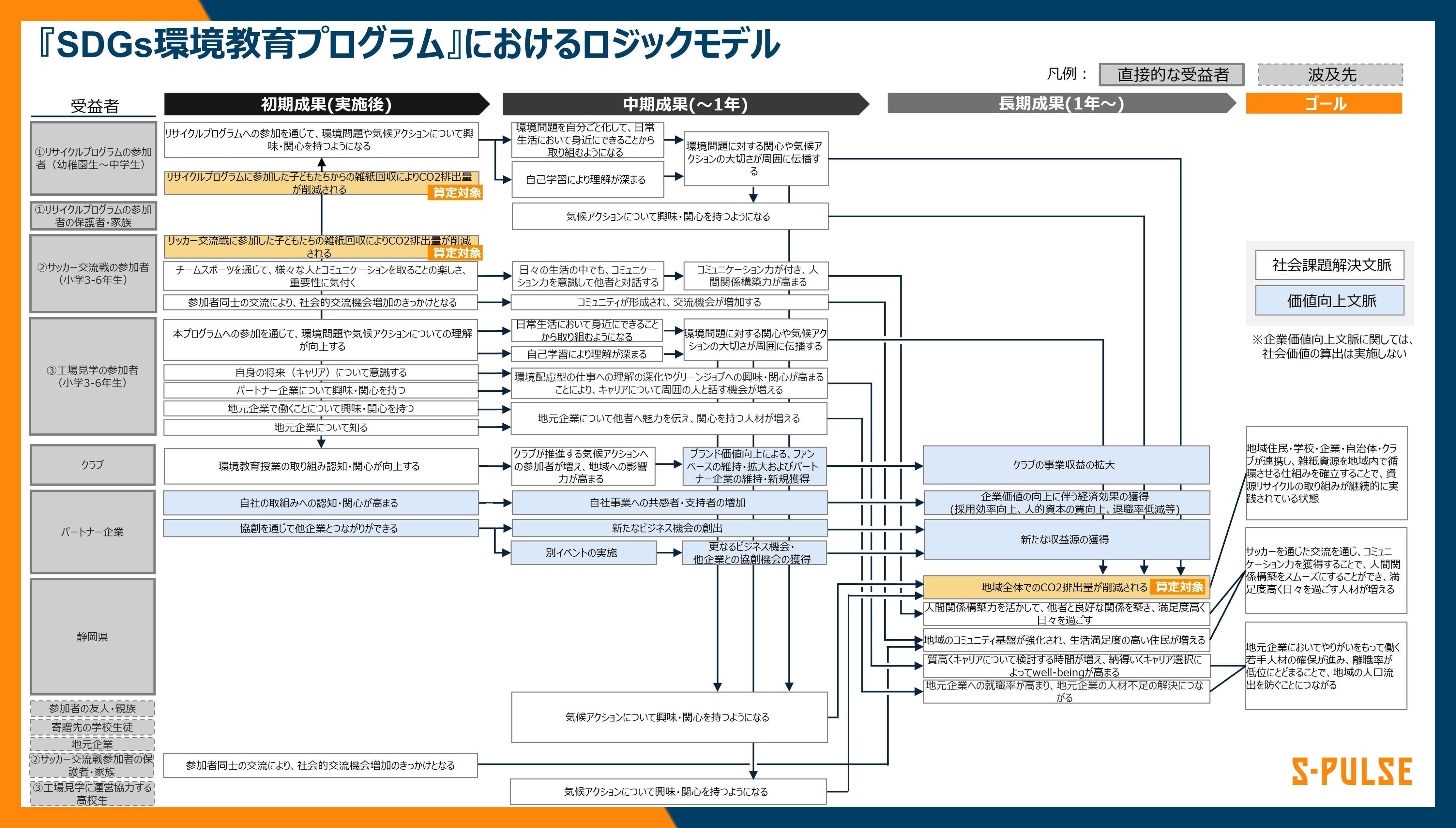 本算定は、ロジックモデルを用いて事業活動と社会的成果の因果関係を整理し、実施しています。具体的には、実施施策から生じる直接的成果(アウトプット)および中長期的に社会に与える変化(アウトカム)を段階的に定義し、本活動がどのような価値の連鎖を通じて最終的な目標の達成につながるかを明確にしています。