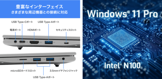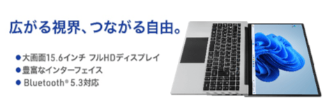 15.6インチの大画面フルHDディスプレイは、資料も動画も鮮明に表示し日々の業務をサポート。さらに、180°まで開くフラット設計で会議中の資料共有もスムーズです。また、日常使いに十分なパフォーマンスをIntel® N100プロセッサーが支えます。
