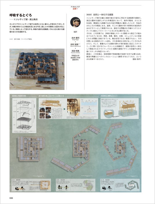 「日本一」は、雨季と乾季で面積が大きく変化する、カンボジアにあるトンレサップ湖の建築群の作品。綿密な調査結果をもとに、季節、漁業、観光、水質、コミュニティなど多岐にわたる問題に対処した、季節ごとに大胆に変化する提案が高く評価され受賞した。
