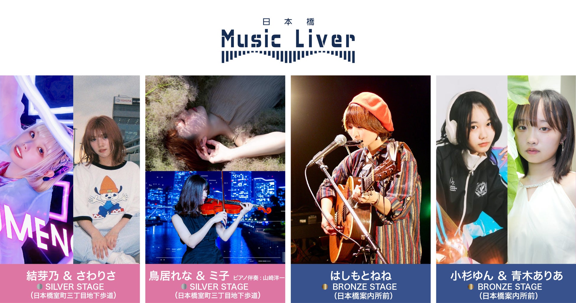 SILVER STAGE(日本橋室町三丁目地下歩道)には都内を中心に路上ライブ・ライブハウス出演など精力的に活動中の結芽乃、大阪府出身シンガーソングライターのさわりさと、物語性のあるオリジナル楽曲をピアノとギター、カメレオンボイスで表現する憑依系シンガーソングライター鳥居れな、ポップスからクラシックまで幅広いジャンルを演奏するヴァイオリニストのミ子が登場。