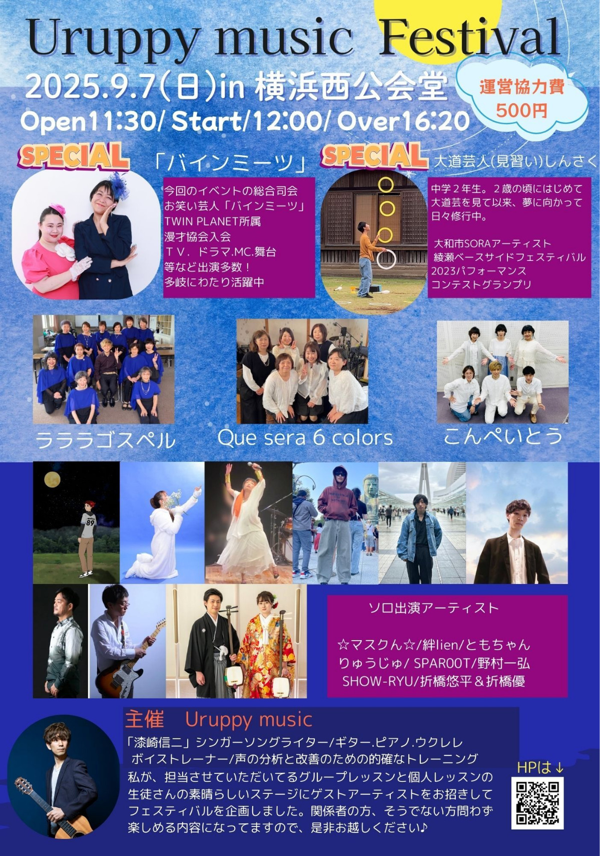 「Uruppy music Festival」が9月7日(日)の正午から午後4時20分まで、西公会堂=西区岡野=で開催される。