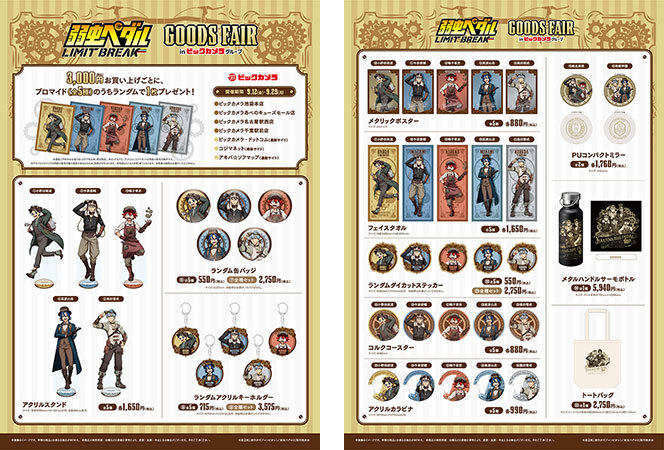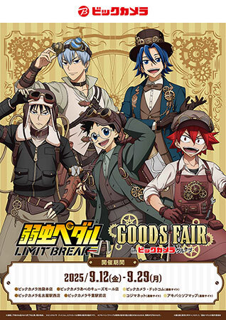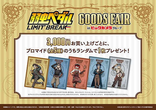 今回開催される「TVアニメ『弱虫ペダル LIMIT BREAK』グッズフェアinビックカメラグループ」では、総北高校から「小野田坂道」「今泉俊輔」「鏑木一差」、箱根学園から「真波山岳」「黒田雪成」の計5キャラクターによる、スチームパンク衣装を着用した等身大パネル展示や、描き下ろし絵を使用した新規グッズの販売が行われる。