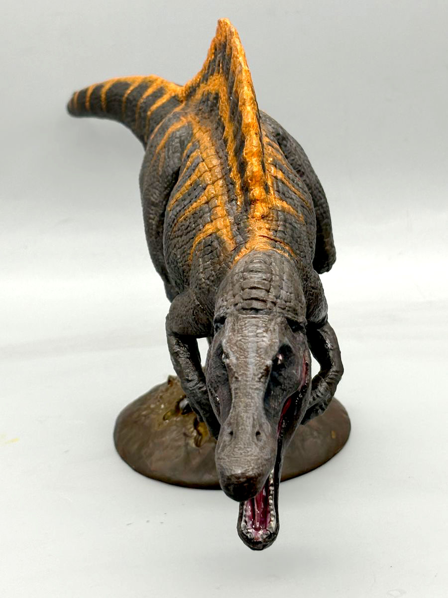 前回、復活の大地版スピノサウルスの特徴でもある背ビレから尻尾にかけて派手なオレンジの縞を体に描き込み、復活の大地版スピノサウルスがほぼ完成! となったワケですが、シマシマに塗り分けた長い尻尾がアライグマみたいになってしまい、これじゃない違和感がありまくりだったので、塗り直しました。