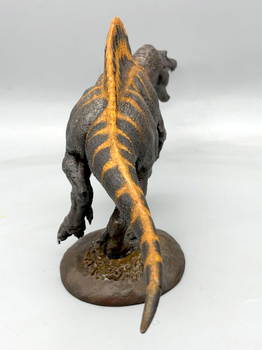 ▲劇場販売されていたスピノサウルスのオモチャを参考に、当初は尻尾を縦縞に塗り分けたのだが、凶暴な肉食恐竜のはずが、そこだけアライグマみたいになってしまった
