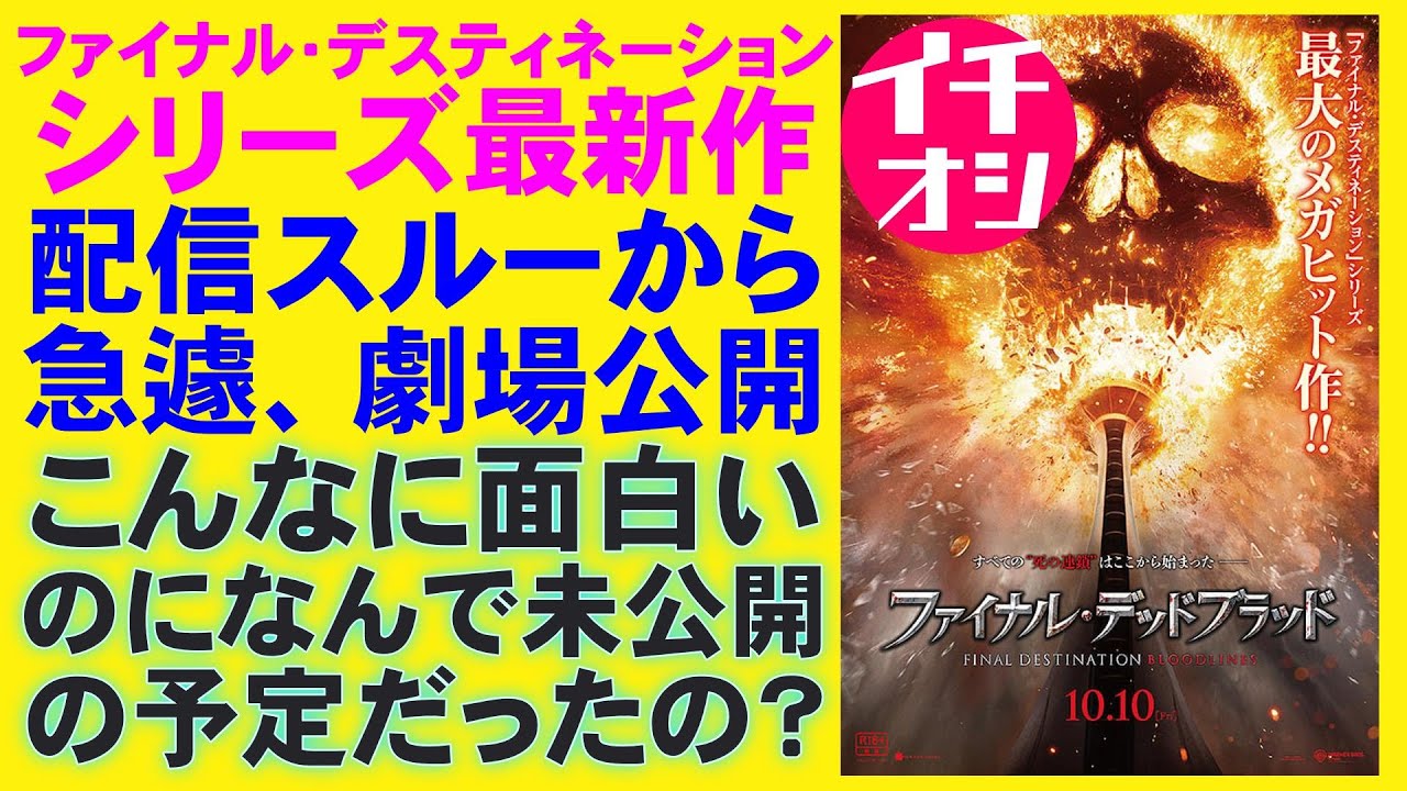 どうも皆さんこんにちは。ミステリー作の 七尾よしです。はい、今日もね、新作映画 1本ご紹介したいと思います。てことでね 、ファイナルデッドプラットですね。本作 はホラー映画ファン大好きファイナル デスティネーションシリーズの最新作と なりますね。え、シリーズ1作目は 2000年のファイナル デスティネーションです。以降2003年 デッドコースター2006年 ファイナルデッドコースター2009年 ファイナルデッドサーキット3D2011 年ファイナルデッドブリッジと続いて本作 が10年14年ぶりの新作で、え、 シリーズ6作目になります。ていうかさ、 6作もあったんですね。え、僕は1作目と 2作目を干渉しています。え、前作までは 劇場公開されていたんですけども、今回は 日本では配信スルーとアナウンスされてい たんですが、どういうわけか急遽10月 10日から劇場公開されたんですね。と 言っても全国10巻公開なので、まあね、 大都市権だけなんですね。え、東京では シネリーブル池袋。ま、こちらはともかく 、え、109シねプレミアム新宿でもね、 公開されているんですよ。この、え、 109シネマズプレミアム。そう、あの 映画干渉料金が4000円とか6000円 とかする超不裕層向けの映画館なんです けどね。あそこで上映されているんですよ 。なので多くの方たちは10月22日から スタートした配信で干渉することになると 思います。アマプラでも、え、配信されて いるんですけども会員なら無料ではなくて 有料レンタルという配信ですので、え、 400円ほどかかります。え、シリーズの ファンの方であれば劇場鑑渉したいところ でしょうけども、近年は人気ホラー シリーズが劇場未公開扱いされることが 目立ちますよね。エスクreム6とか資料 の払技の最新作などこれら配信スルーされ ちゃいましたからね。なんでなんですかね 。円安で買い付価格が上昇して工業収入 だけではとても、え、賄えないということ なんですか?そもそも日本の映画 マーケットはハリウッドから相手にされて ないのか?ま、ここら辺はよく分かりませ んけども、本作は先日レビューしたミガ 2.0とは真逆で配信スルーされる予定が 劇場公開されることになりました。え、ミ 、MIAN2.0の方は劇場公開が決まっ ていて、予告編まで流されていたのに急遽 キャンセルされたんですよね。それにして もこのファイナルデッドフラット どうして急遽劇場公開が決まったん でしょうかね。ミーガンの場合は全米で 工業が大けしたからなんですけども、 こちら本作はどうしてなのか。ファンの 熱い要望が配給会社に届いたからなのか。 それとも実は最初っ ていたのに配信スルーからの劇場公開決定 というキャッチコピーで注目を集める一種 の宣伝手法だったのか。いや、もしね、 これが宣伝者であれば実にうまくいったと 思いますよ。なぜなら国内ミニシアター 工業収入ランキングで1周目は2位でした し、2周目は周囲になりましたからね。 ネット界隈でも話題になっているようです 。あ、そういえばホラー映画 キャンディマンのこのキャンディマンを 演じていたトニートッドが2024年にお 亡くなりになりました。で、このトニー トッドなんですけども、彼はシリーズを 通してウィリアムジョンブラッドワースと いう、え、市の運命のルールについて知識 のある謎の黒人を演じてきました。もう1 作目からね、登場していましたよね。で、 本作でも登場するんですけど、どうやら これがね、遺作となってしまったようです 。え、1作目では死の運命に詳しい葬儀屋 で主人公に謎の助言を与えるという キャラクターでした。え、詳しい情は謎に 包まれていて、前作も謎のままだったん ですけど、果たして本作で彼の正体は はっきりするんでしょうか?シリーズを 追ってきたファンの方たちなら気になる ポイントですよね。え、それについては ネタバレになるので、ここでは明かしませ んけども、是非干渉して確かめてみて ください。はい。というわけでね、え、 ストーリーをざっくりと簡単に説明し ましょう。大学生のステファニーは自分と 家族が悲惨な死を遂げる悪夢を繰り返し みんでいました。それがただの夢ではない と確信した彼女は唯一の手がかりとなる 人物を探すため故郷へ向かいます。実家に 帰るんですね。やがて50年以上語られて こなかった死の連鎖の原点にたどり着き、 運命には逆らえないという不常な法則が今 なお続いていることを知ります。過去と 未来が工作する中、ステファニーはその血 の因果と退治することになりますがバイガ .ドcomみたいなね、え、そんな内容と なっておりました。はい、というわけでね 、これから詳しくレビューするわけなん ですけども、その前に映画の評価額をつけ たいと思います。大人の映画干渉料金 2000円を満点として、この映画なら いくらまで出せるかということで評価額を つけていきましょう。がファイナルデッド ブラッド評価ズバり 1500円収作 はうーん 配信スルーされてしまったミー