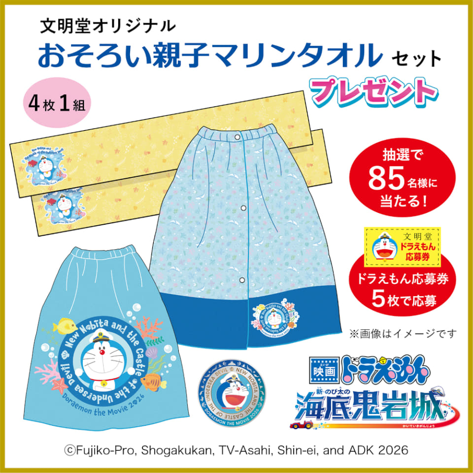 また、文明堂オリジナルのドラえもんのタオルセットが当たるキャンペーンも実施。「映画ドラえもん どら焼き」パッケージ裏面のドラえもん応募券を5枚集めてハガキで応募すると、抽選で85名に当たる。