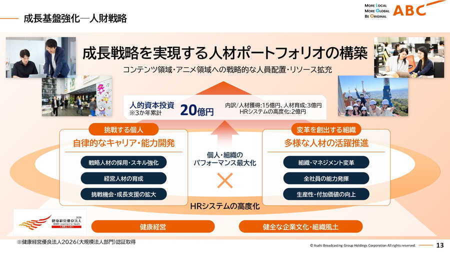 成長基盤の強化として、人材投資とAI活用も進める。人的資本には20億円を投じ、人材獲得に15億円、人材育成に3億円、HRシステムの高度化に2億円を配分。コンテンツやアニメ領域への戦略的人員配置を進めるほか、経営人材の育成やスキル強化にも取り組む。