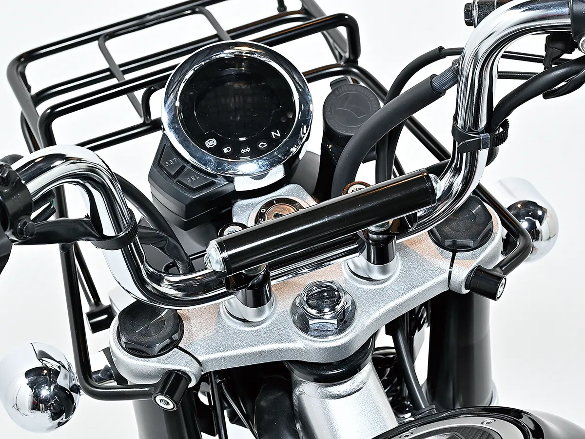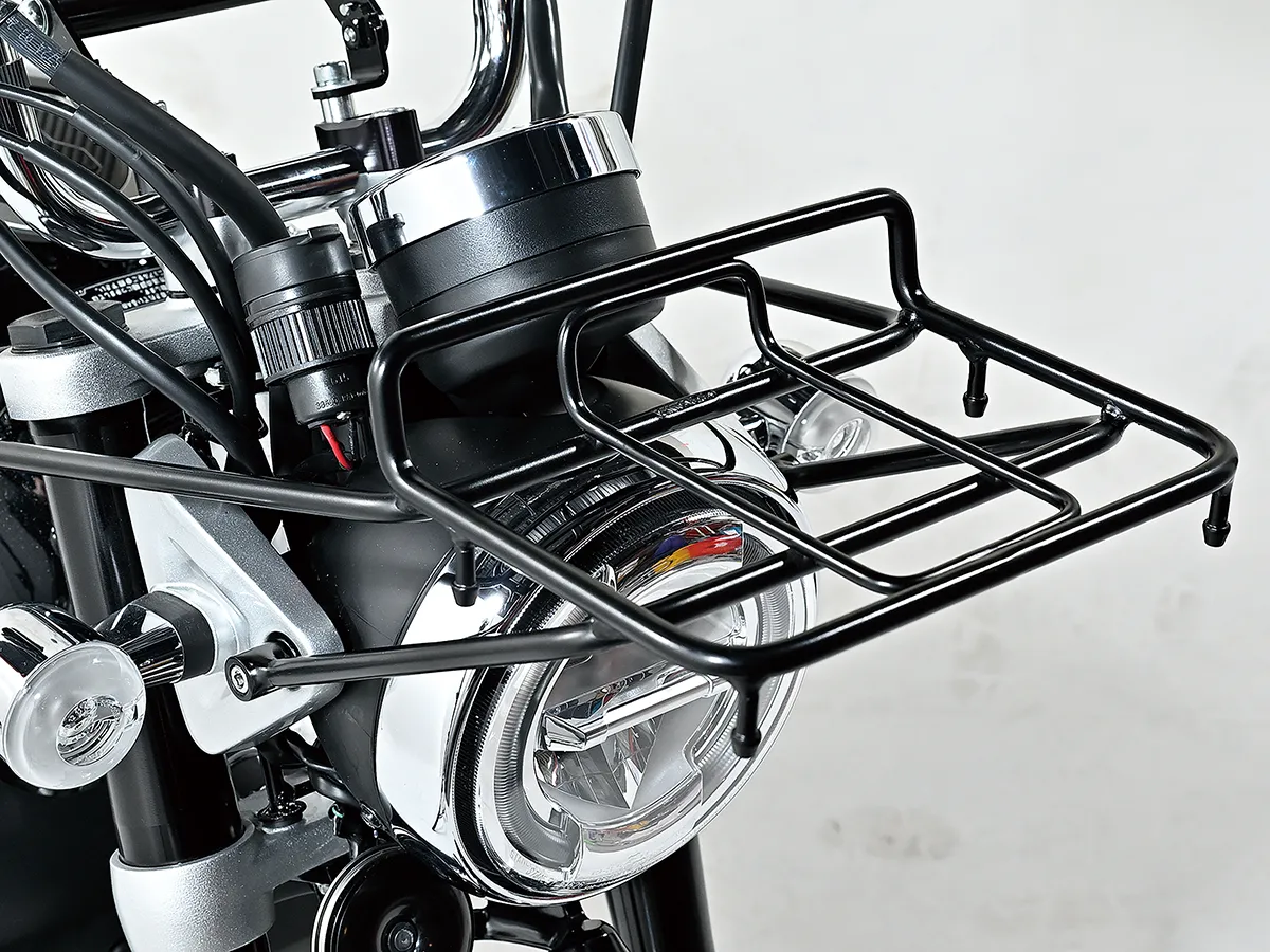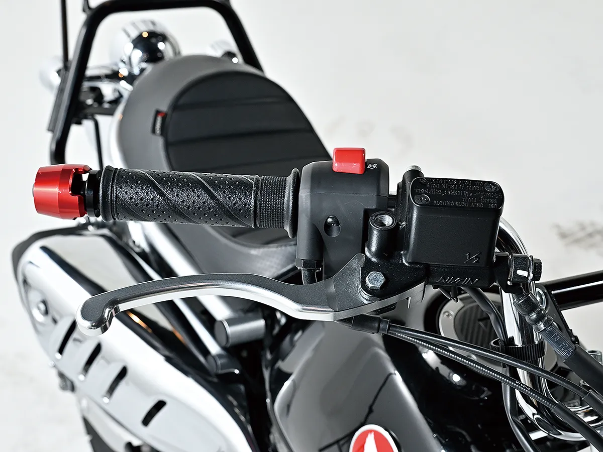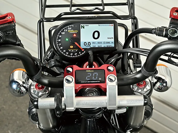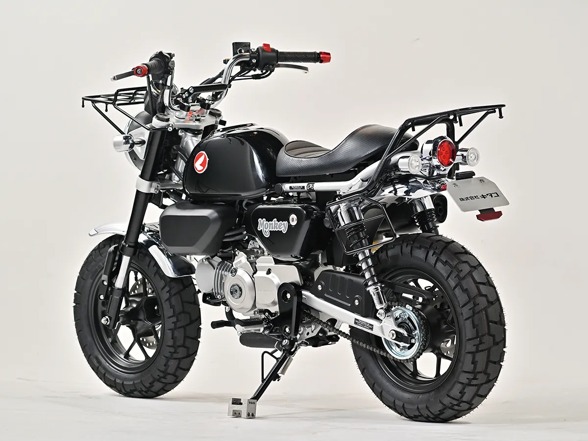 こちらのモンキーはカスタム製作コーナーでその製作工程を紹介している車両で、キタコの手によるものだ。前後フェンダーに手を入れスタイルアップを図る一方、前後にキャリアを追加することで積載性を大きくアップ。サイドバッグサポートも取り付ける。またハンドル周りはアクセサリー取り付けのバーやUSB電源、多機能ハンドルスイッチを装着することで使い勝手を大きく向上させることに成功。これらの内容は楽に真似することができるのもうれしい点だろう。