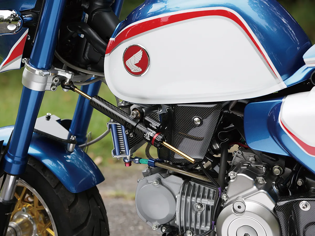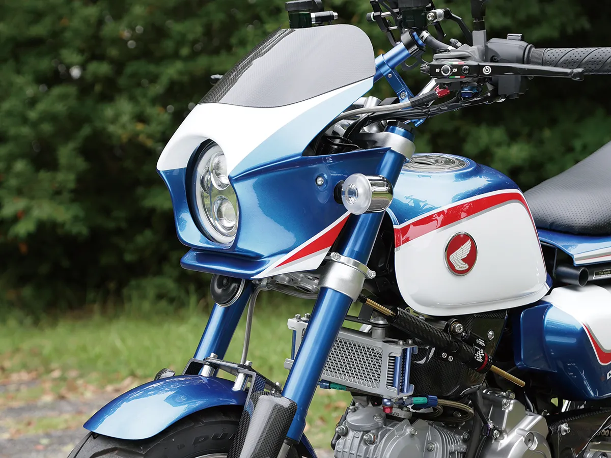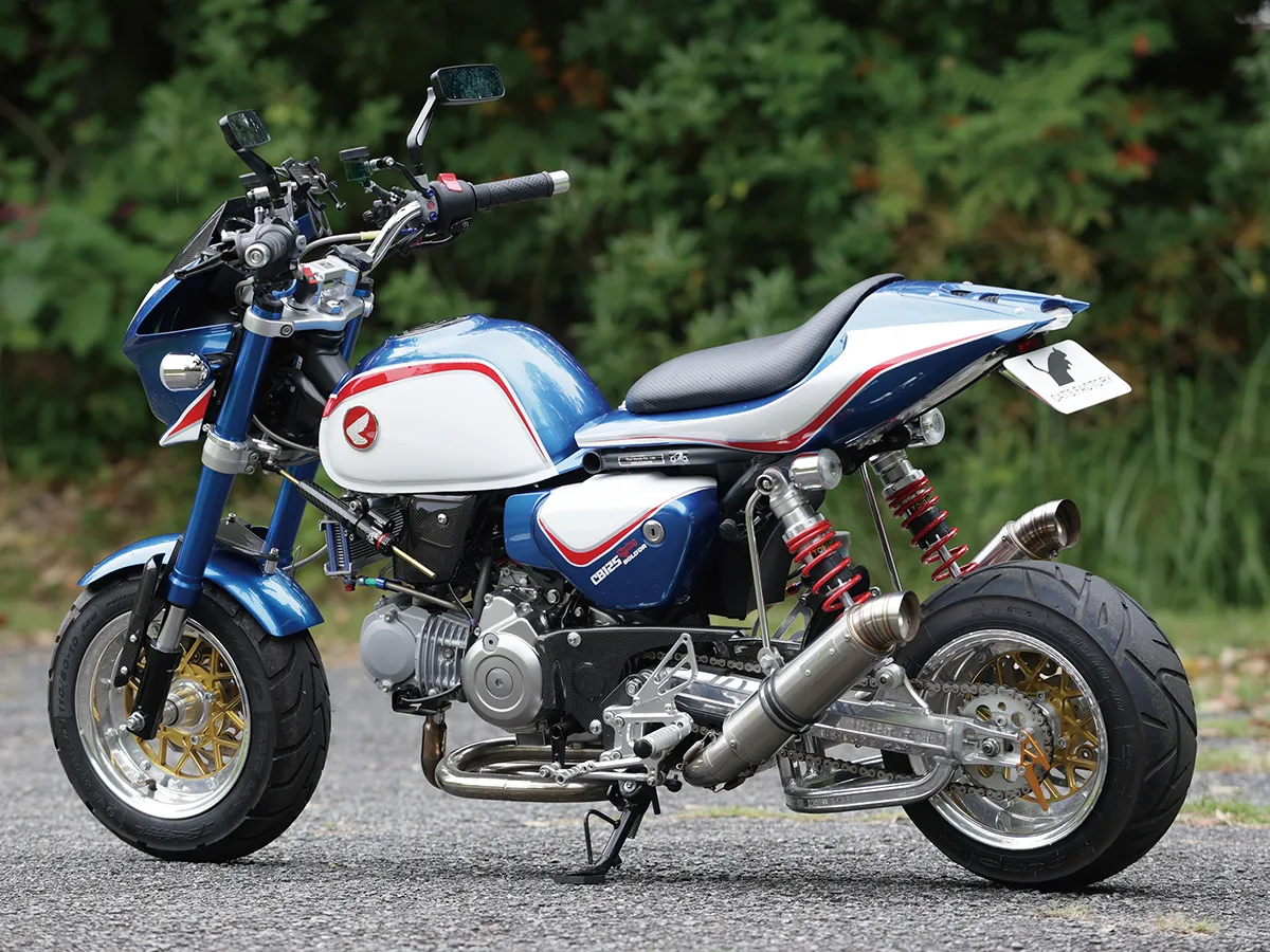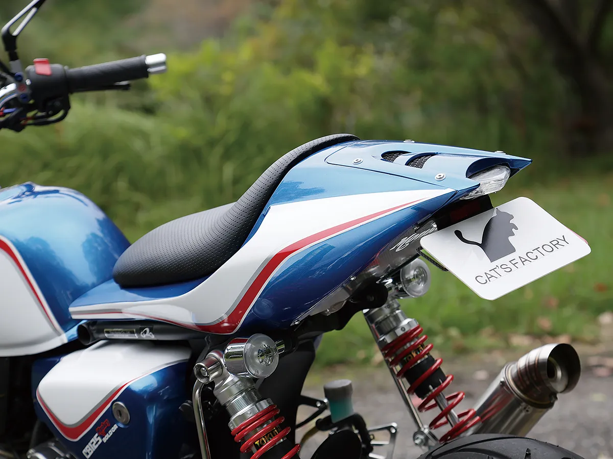 ホンダらしいトリコロールカラーが目を引くこちらの車両は、CBスーパーボルドールのスタイルをモンキーで再現しようと製作された。製作したキャッツファクトリーのカスタムコンプリートの基本構成(ロー&ロング+10インチホイール)を踏襲しつつオリジナルのビキニカウル、シートカウルをセットし独自のフォルムを作り上げている。マッシブで高品質な足周りの構成は車体の雰囲気にもマッチし、同店がこだわる全体のバランスが見事に取られているのが分かる。