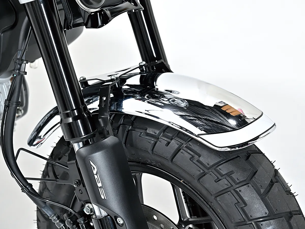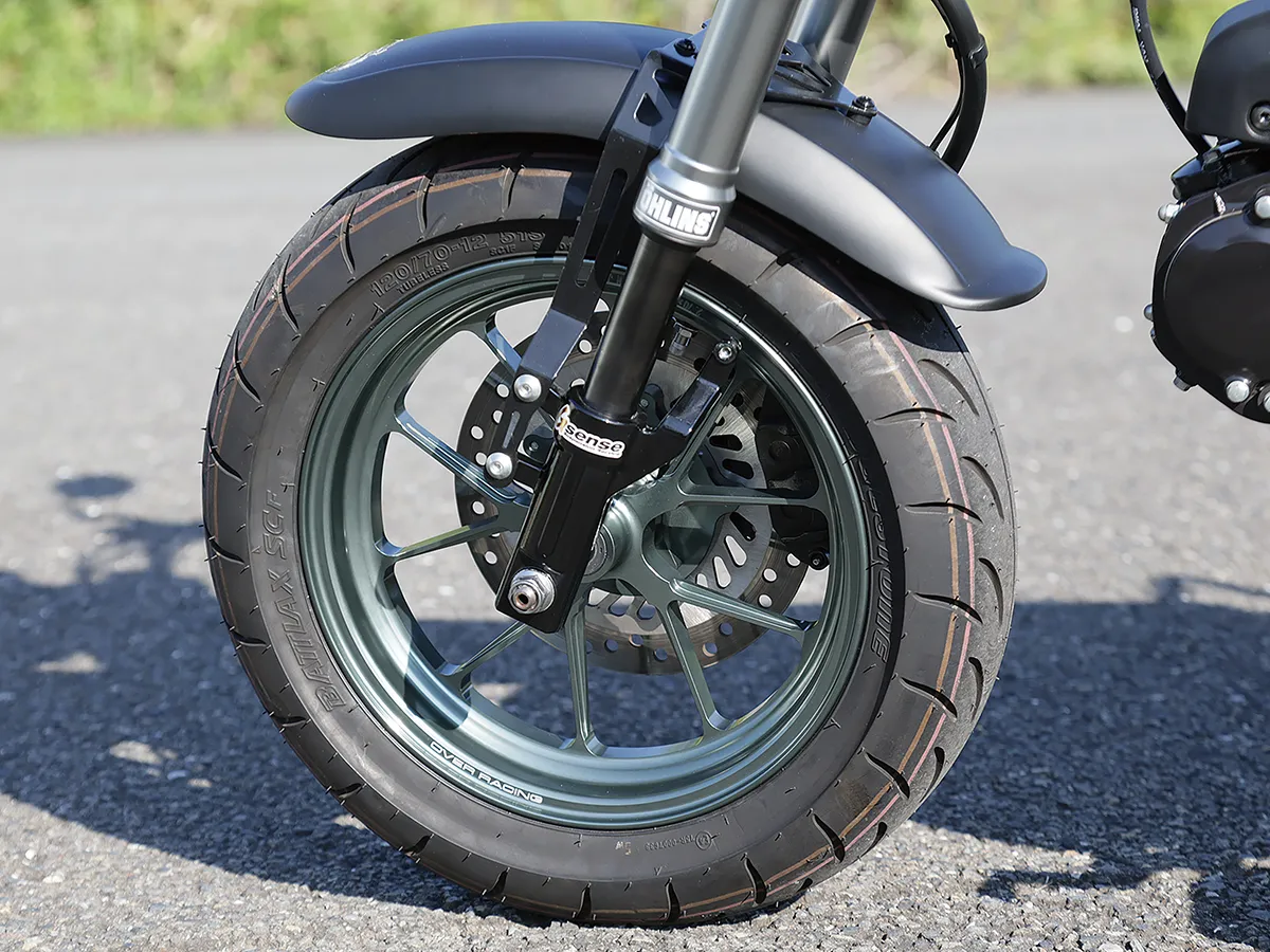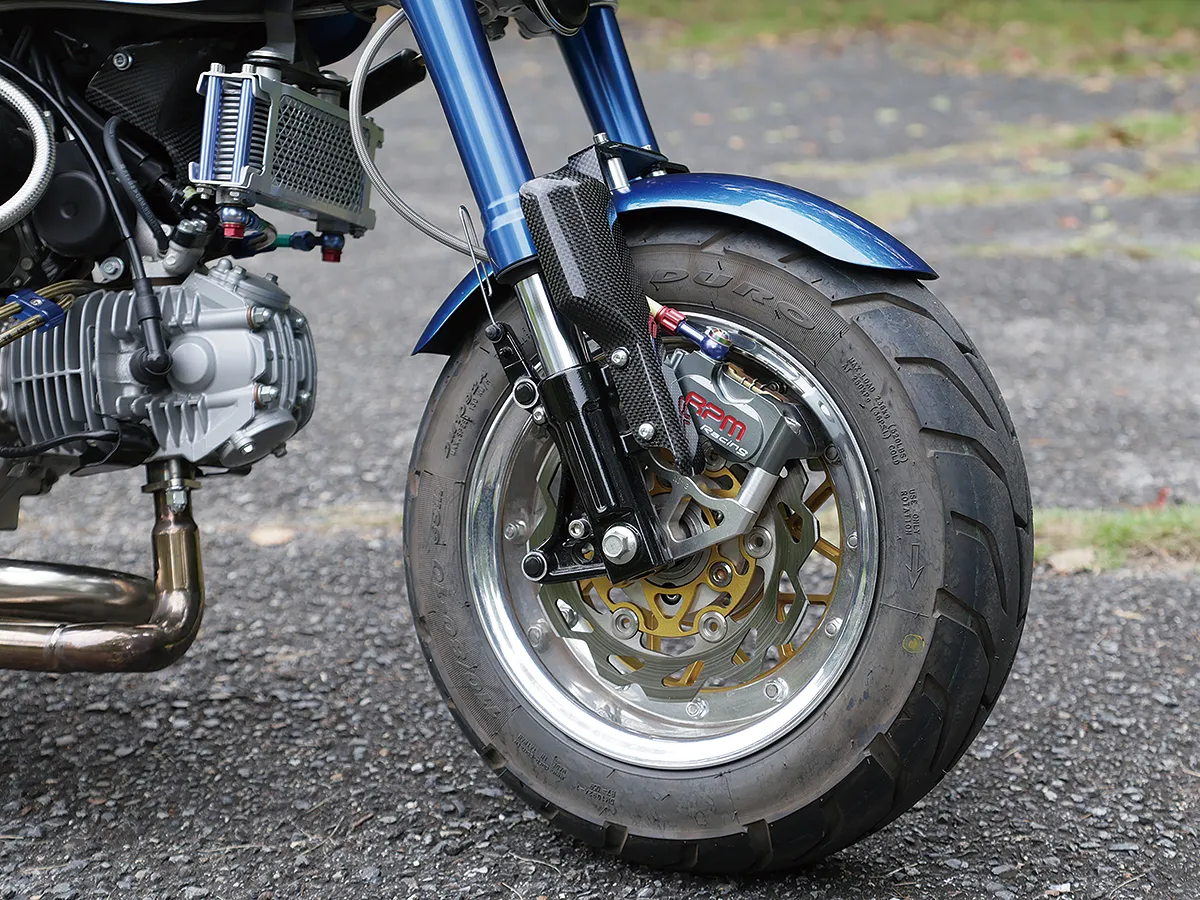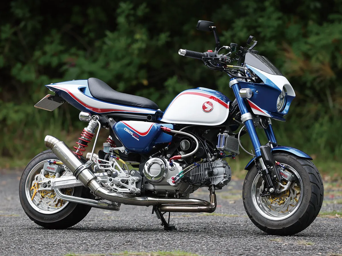 ホンダらしいトリコロールカラーが目を引くこちらの車両は、CBスーパーボルドールのスタイルをモンキーで再現しようと製作された。製作したキャッツファクトリーのカスタムコンプリートの基本構成(ロー&ロング+10インチホイール)を踏襲しつつオリジナルのビキニカウル、シートカウルをセットし独自のフォルムを作り上げている。マッシブで高品質な足周りの構成は車体の雰囲気にもマッチし、同店がこだわる全体のバランスが見事に取られているのが分かる。