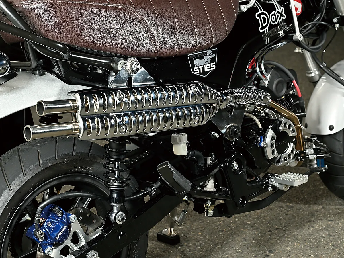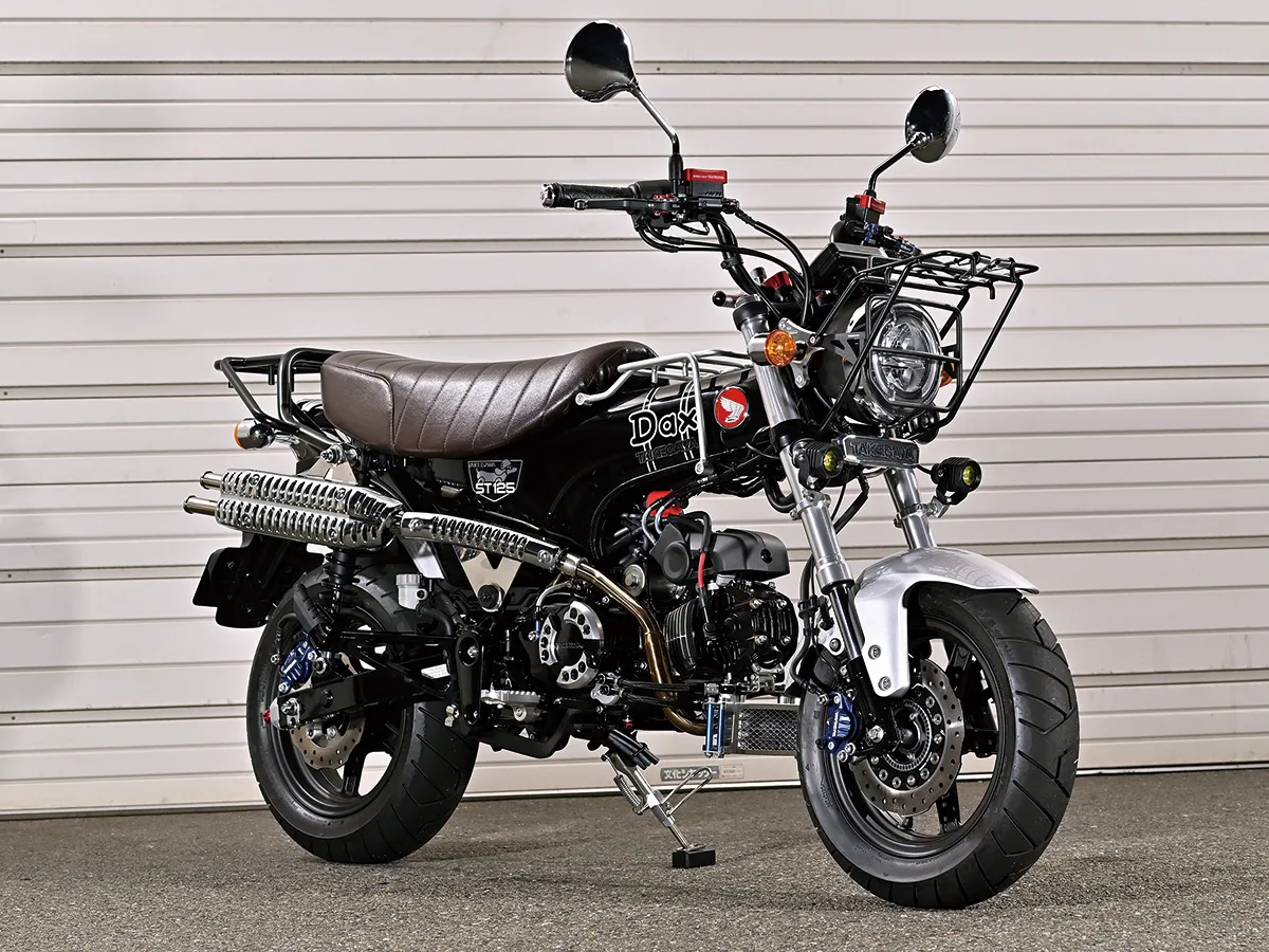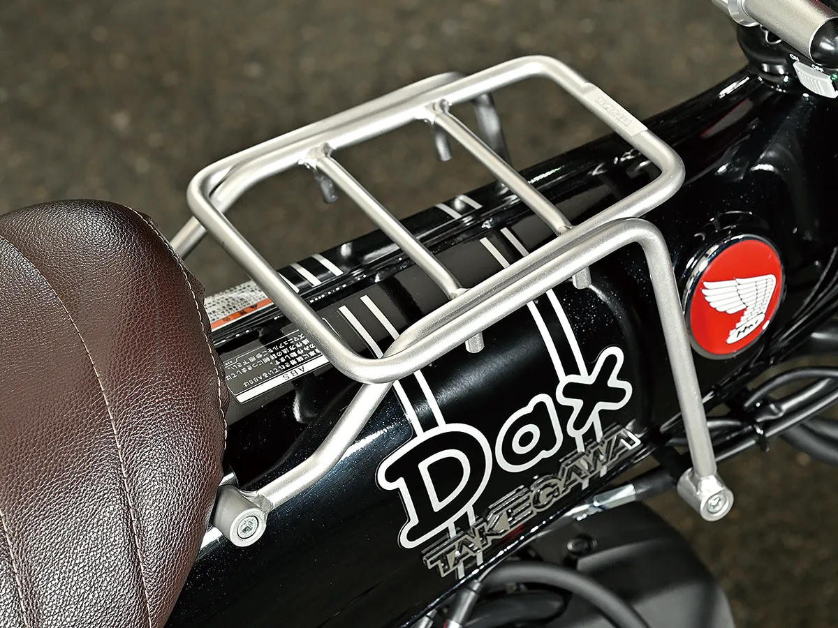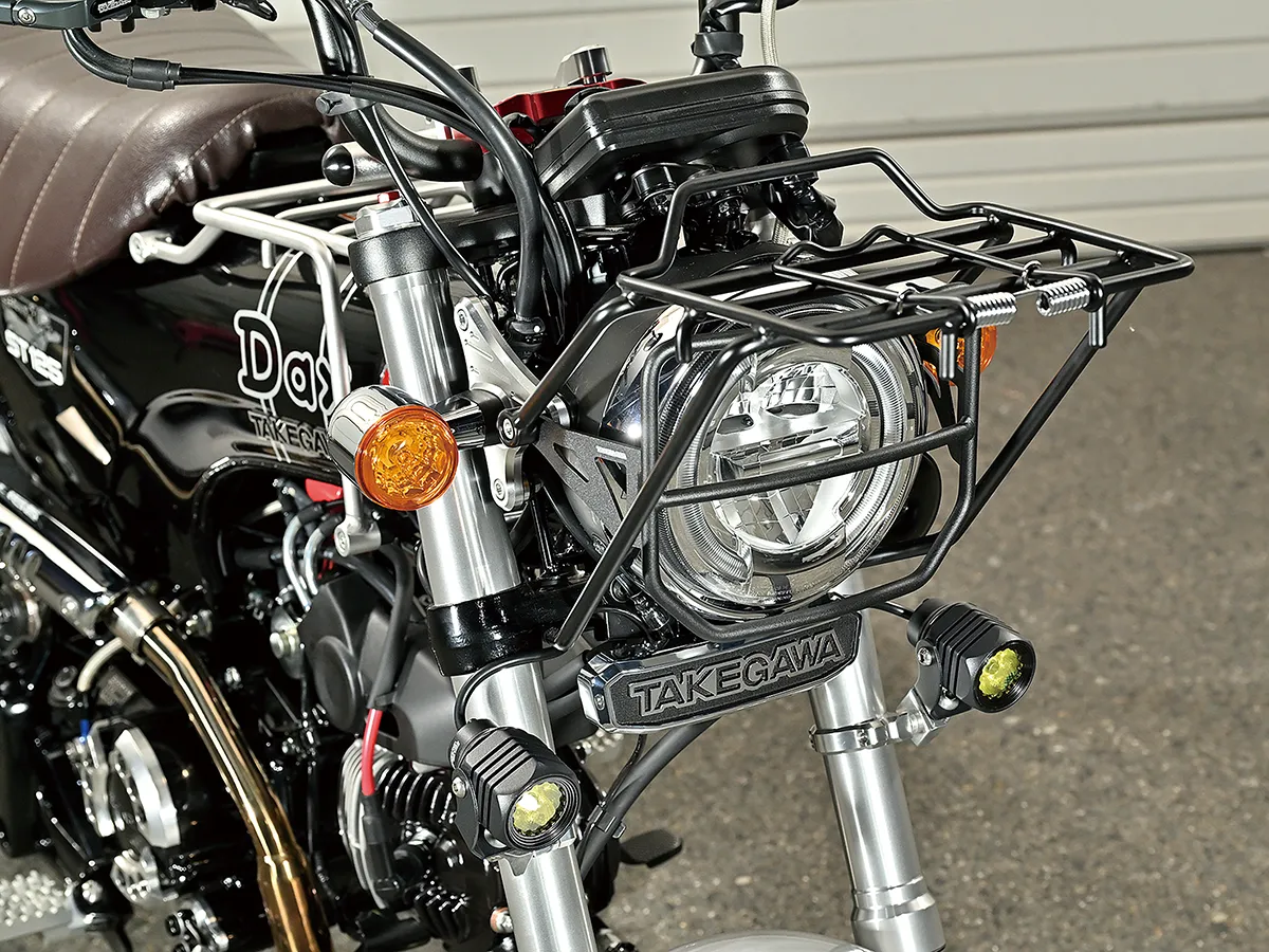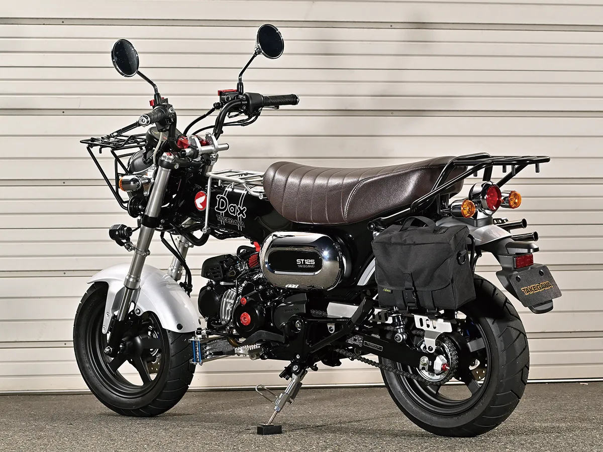 このダックスはカスタム製作コーナーで一部の製作工程を紹介しているが、それ以外も全身カスタムがされたハイレベルな車両。製作したのはスペシャルパーツ武川で、あふれるパワーを持ちながら実用性にも優れているのがポイントだ。エンジンは145ccへとボアアップされハイカム、強化クラッチ&オイルポンプを装着。一方3つのキャリアを取り付けスタイルと実用性を向上し、全方位に抜かり無いカスタムとなっている。