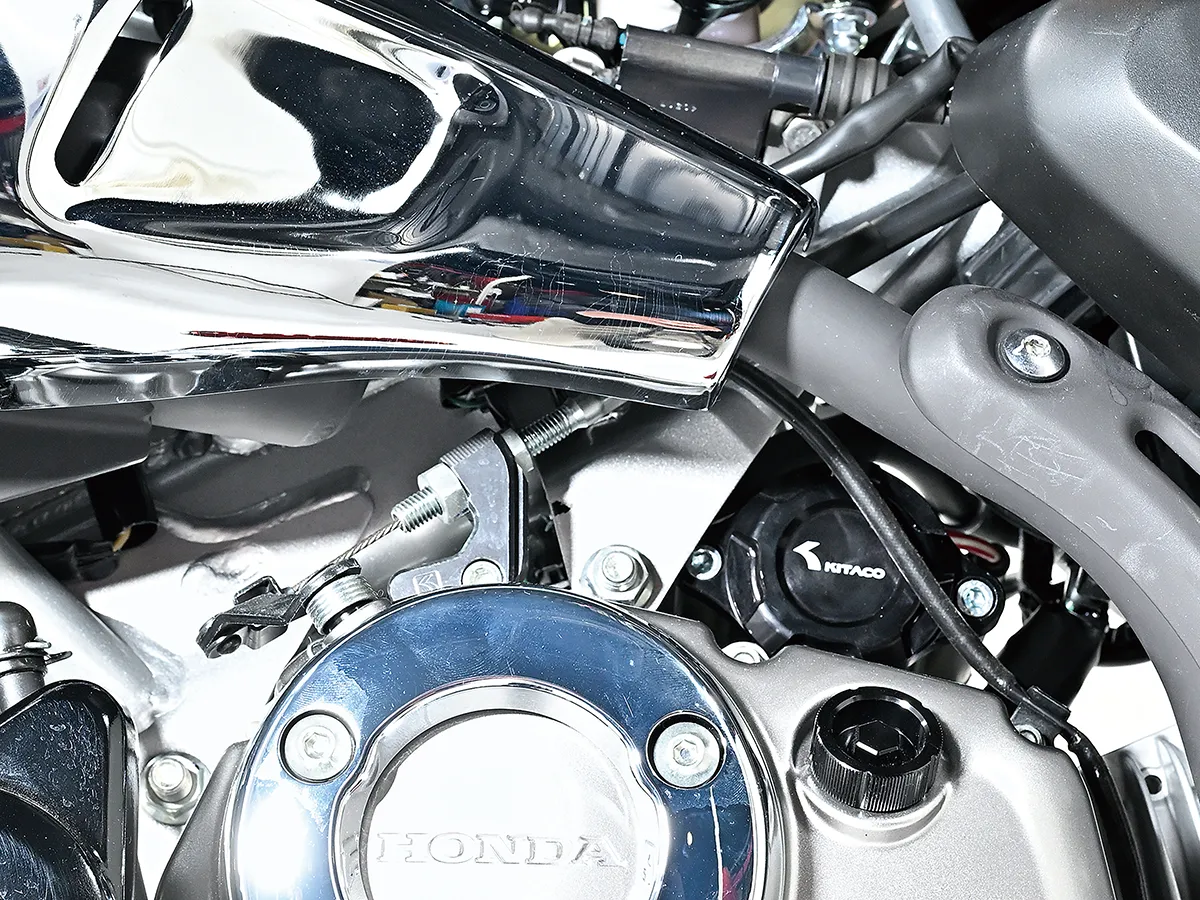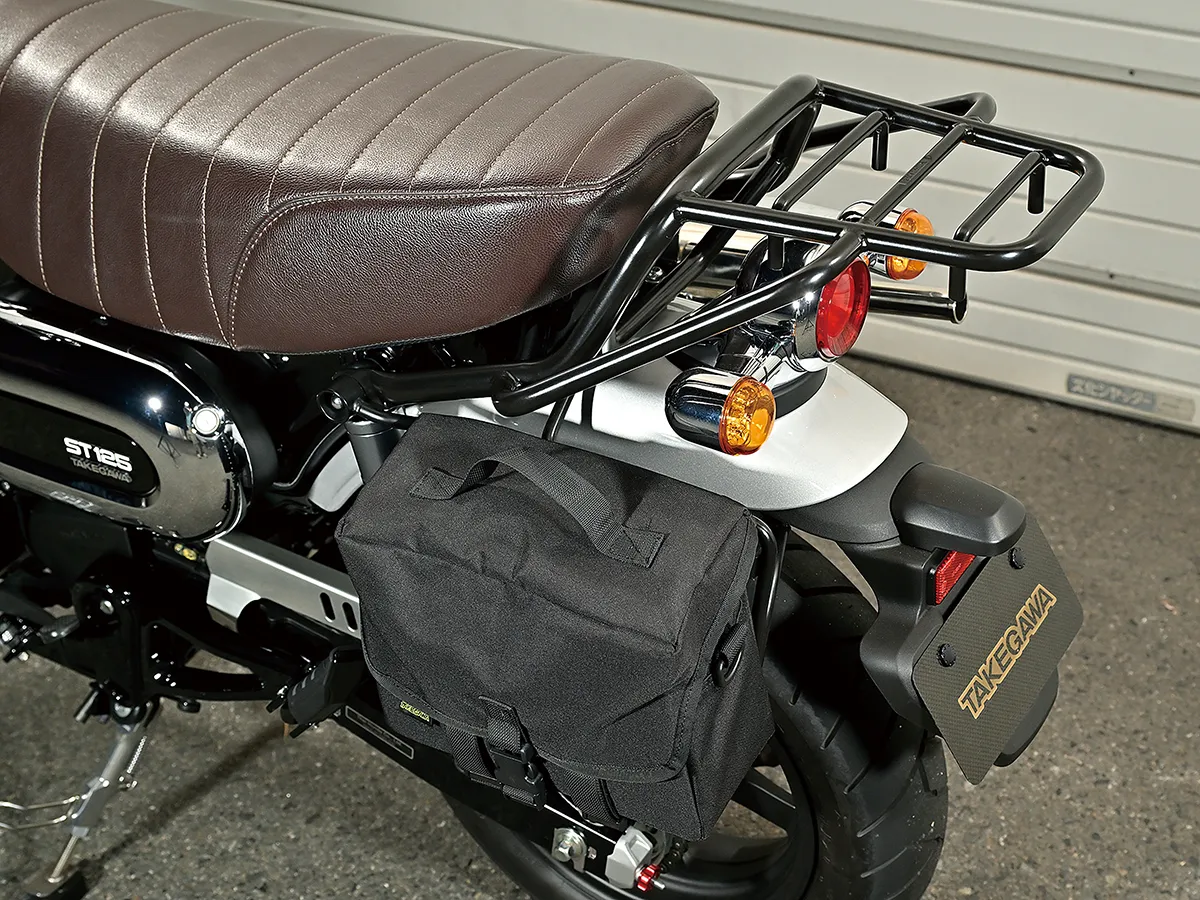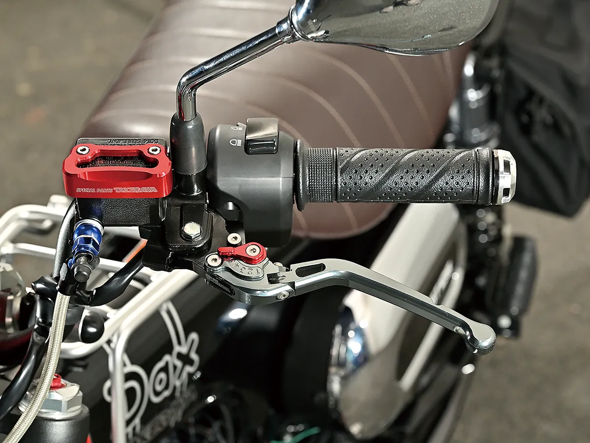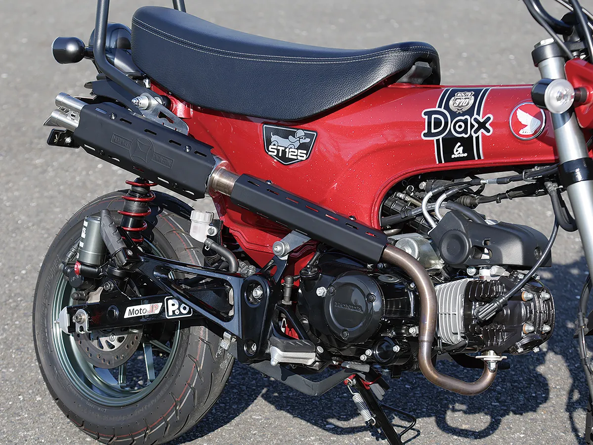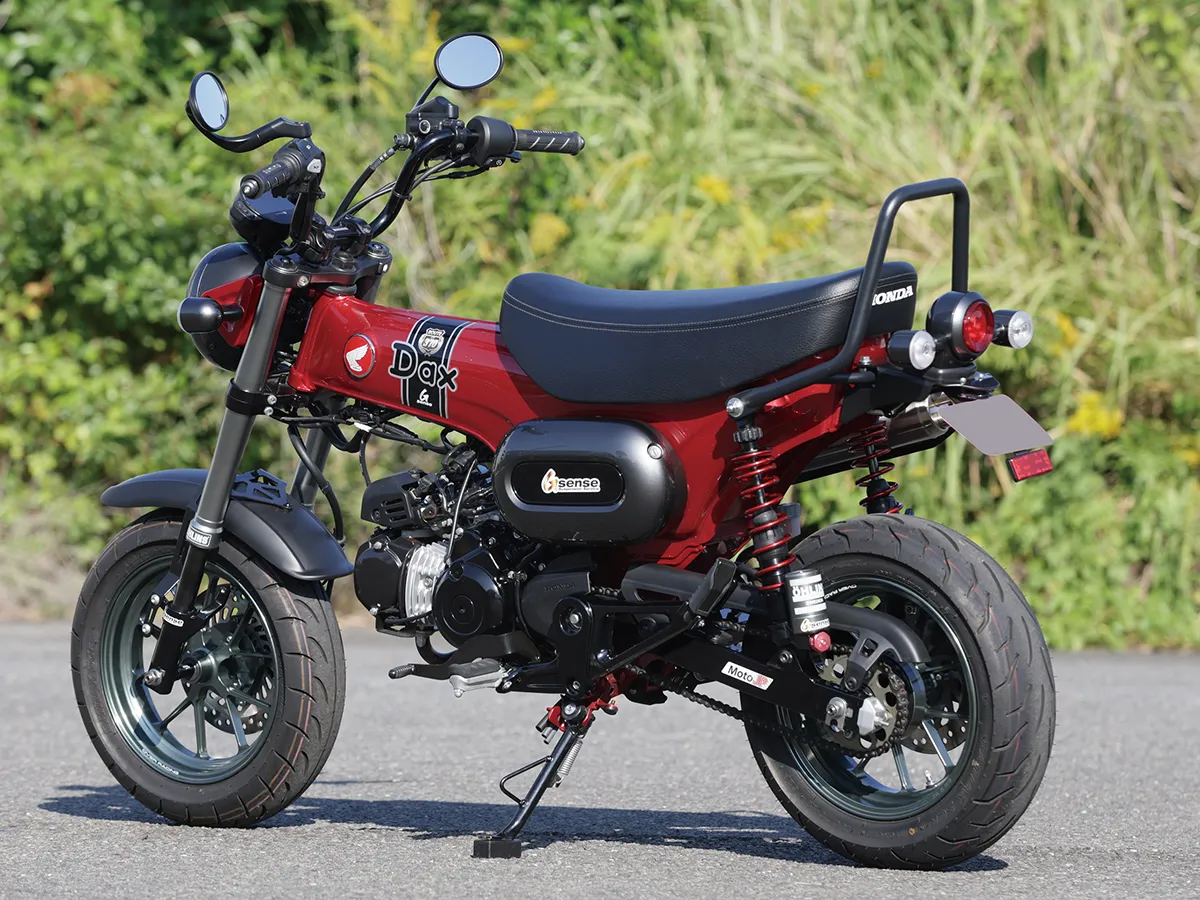 このダックスはカスタム製作コーナーで一部の製作工程を紹介しているが、それ以外も全身カスタムがされたハイレベルな車両。製作したのはスペシャルパーツ武川で、あふれるパワーを持ちながら実用性にも優れているのがポイントだ。エンジンは145ccへとボアアップされハイカム、強化クラッチ&オイルポンプを装着。一方3つのキャリアを取り付けスタイルと実用性を向上し、全方位に抜かり無いカスタムとなっている。