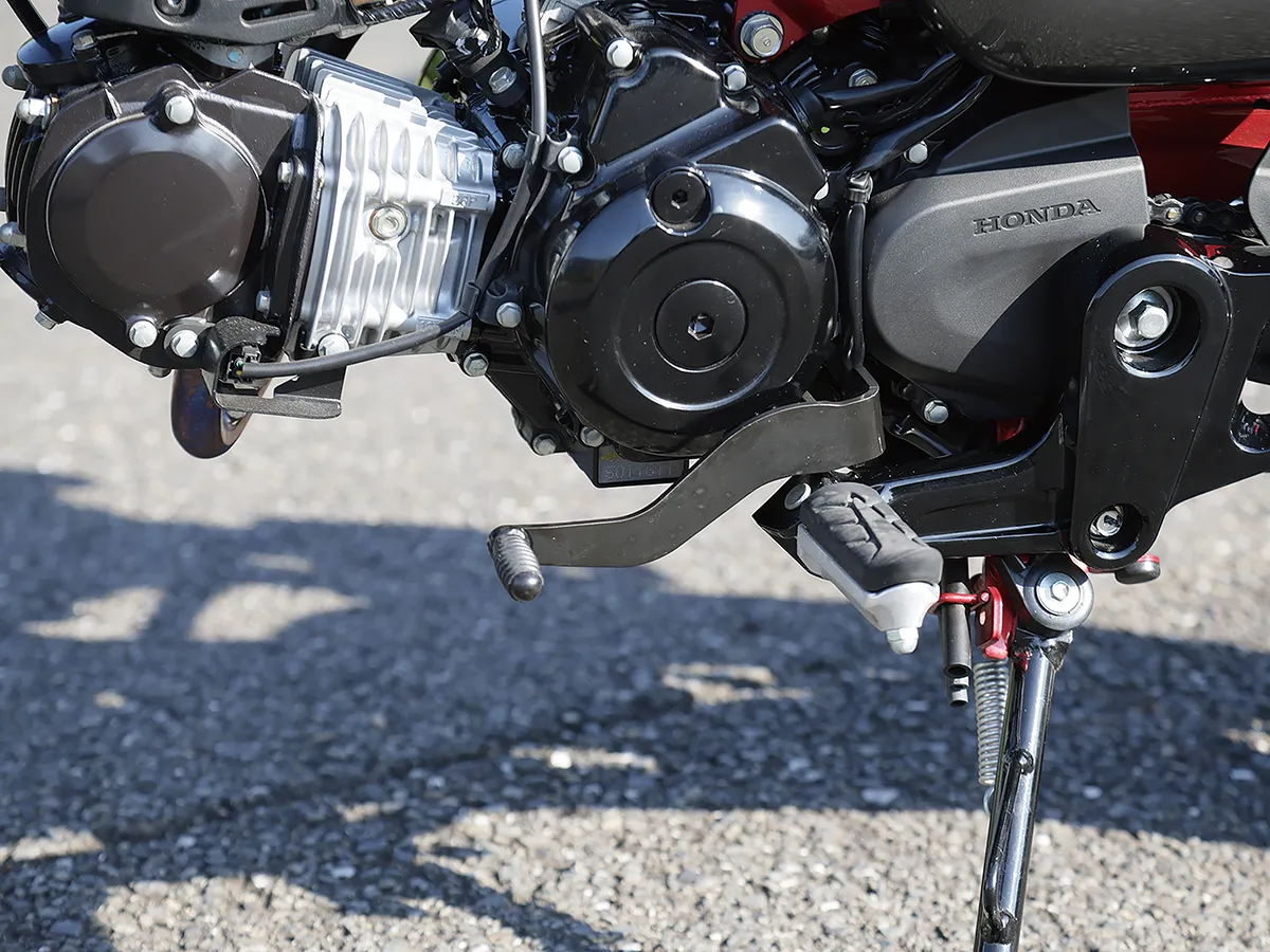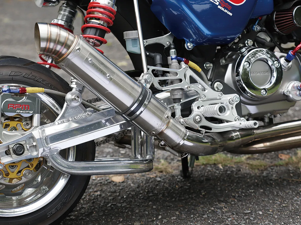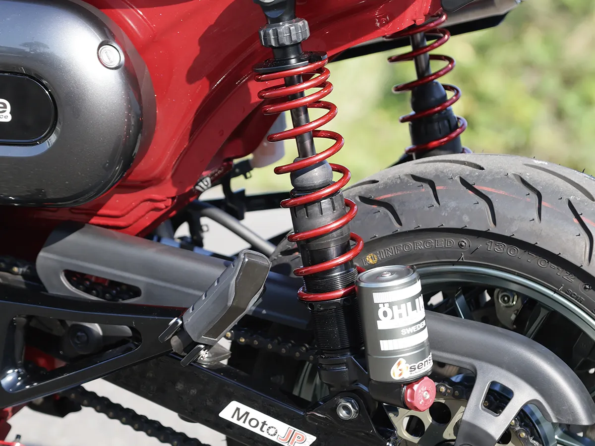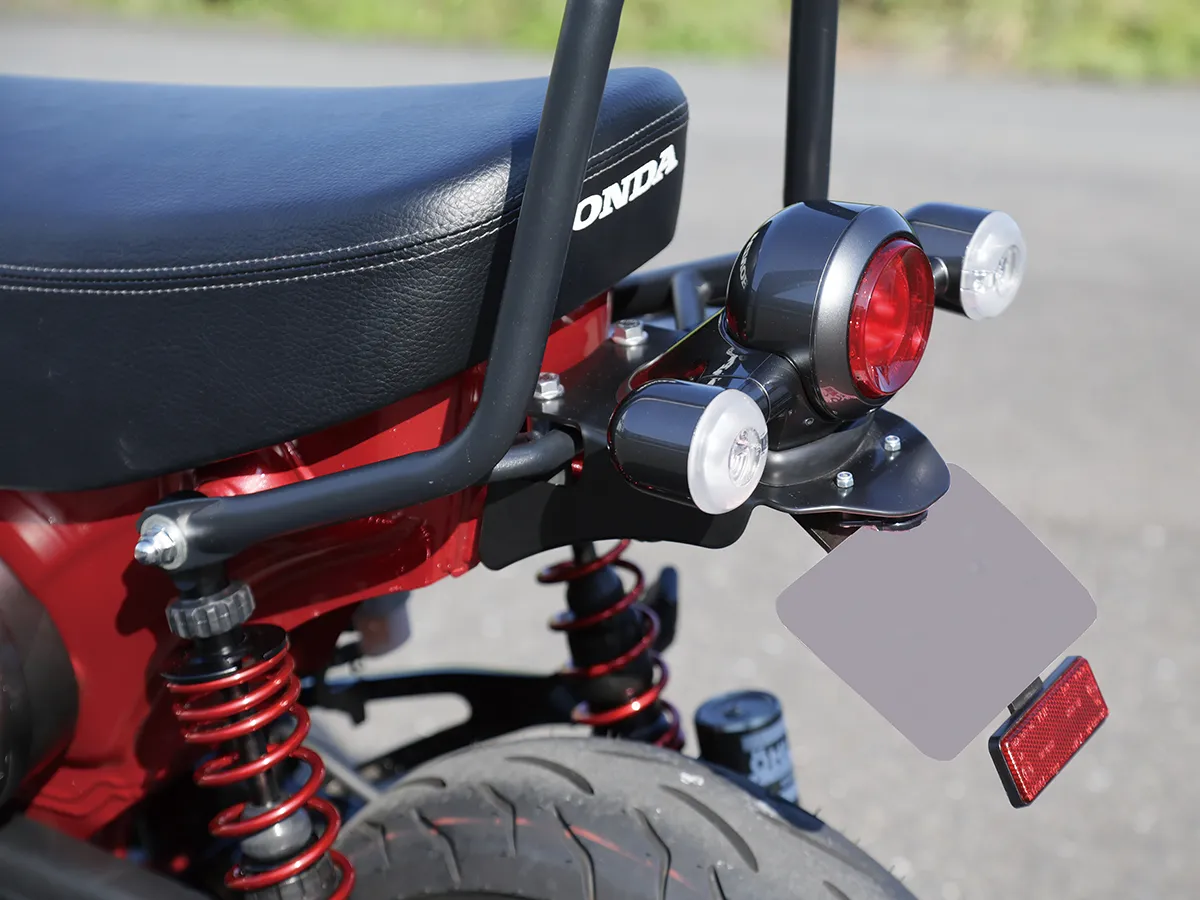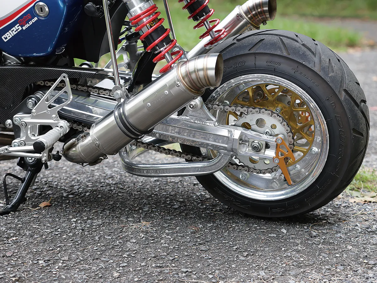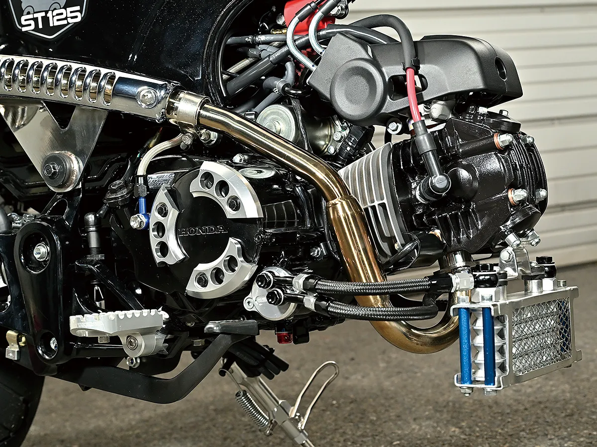 このダックスはカスタム製作コーナーで一部の製作工程を紹介しているが、それ以外も全身カスタムがされたハイレベルな車両。製作したのはスペシャルパーツ武川で、あふれるパワーを持ちながら実用性にも優れているのがポイントだ。エンジンは145ccへとボアアップされハイカム、強化クラッチ&オイルポンプを装着。一方3つのキャリアを取り付けスタイルと実用性を向上し、全方位に抜かり無いカスタムとなっている。
