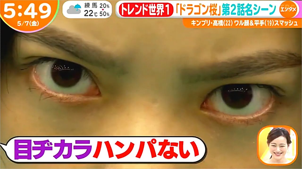 平手友梨奈「ドラゴン桜」阿部寛、高橋海人、目力シーン!SNSで話題のシーン満載!2週連続!ツイッター世界トレンド1位に!はやドキ!エンタメコーナー 5月7日 平手友梨奈出演ドラマ「ドラゴン桜」初回平均視聴率は14.8%、4月クールの民放連続ドラマ初回トップの好発進となり、フジテレビ“月9”「イチケイのカラス」初回(5日)の13・9%を上回った。楓先輩フィーチャー回の第2話は視聴率13.9%!16年ぶり復活が話題となった第1話から下落も好調キープ!前作の原作「ドラゴン桜」(03~07年連載)の15年後を描くが、続編は現代の日曜劇場にふさわしいエッセンスを盛り込んだドラマオリジナルの物語が展開される。