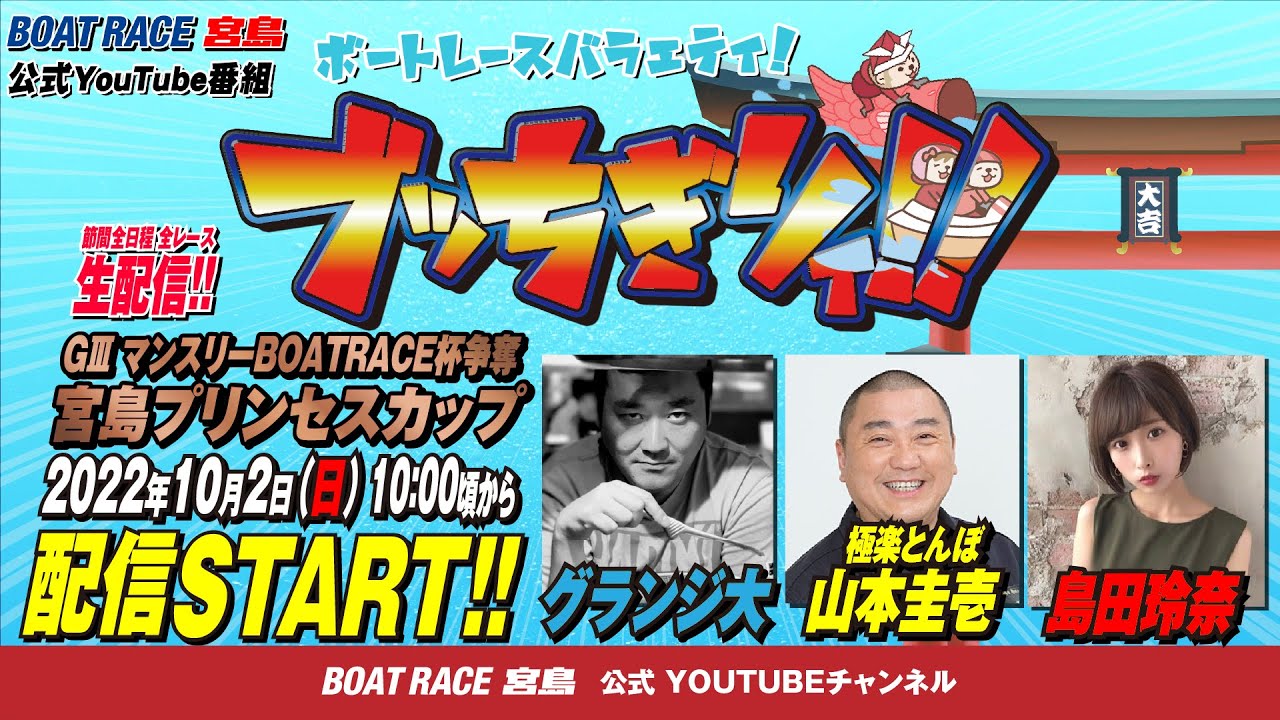 【ボートレース宮島 公式YouTube番組】 ボートレースバラエティ “ブッちぎりィ!!”【グランジ大&極楽とんぼ山本圭壱&島田玲奈】