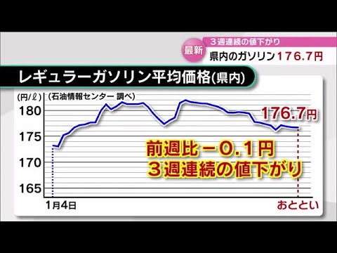 石油情報センターによりますと、28日時点の県内のレギュラーガソリンの平均販売価格は、1リットルあたり176.7円でした。