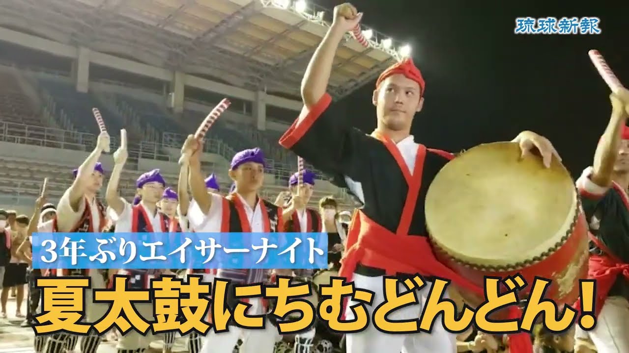 沖縄県内各地の青年会などが沖縄市内の各所でエイサーを披露する「エイサーナイト2022」が26日、沖縄市のコザ運動公園陸上競技場で3年ぶりに開幕した。主催者によると、会場には2千人以上の観客が詰めかけ、エイサーの演舞に熱視線を送った。