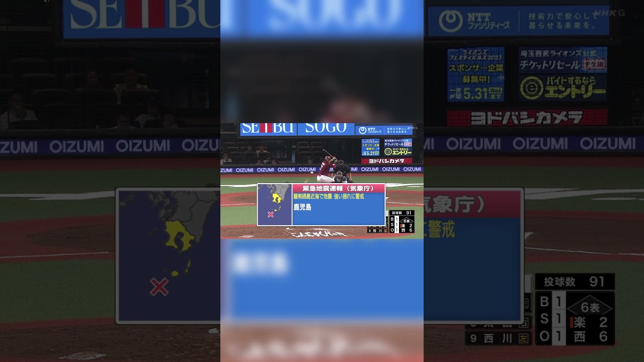 今月13日の埼玉西武ライオンズVS東北楽天ゴールデンイーグルス(ベルーナドーム)はトカラ列島で最大震度5弱を観測しました。