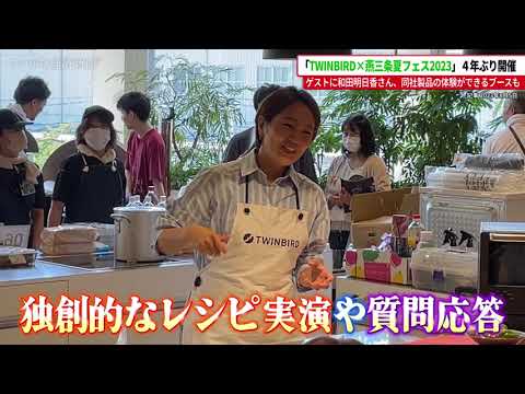 株式会社ツインバード(新潟県燕市)は8月5日、「TWINBIRD×燕三条夏フェス2023」を4年ぶりに開催した。会場には市内外からの飲食店や協力企業の体験ブースが出店したほか、同社製品のアンバサダーを務めるタレントで料理家の和田明日香さんもゲストで登場。30度を超す炎天下の中にもかかわらず、親子連れをはじめ多くの人が訪れていた──。