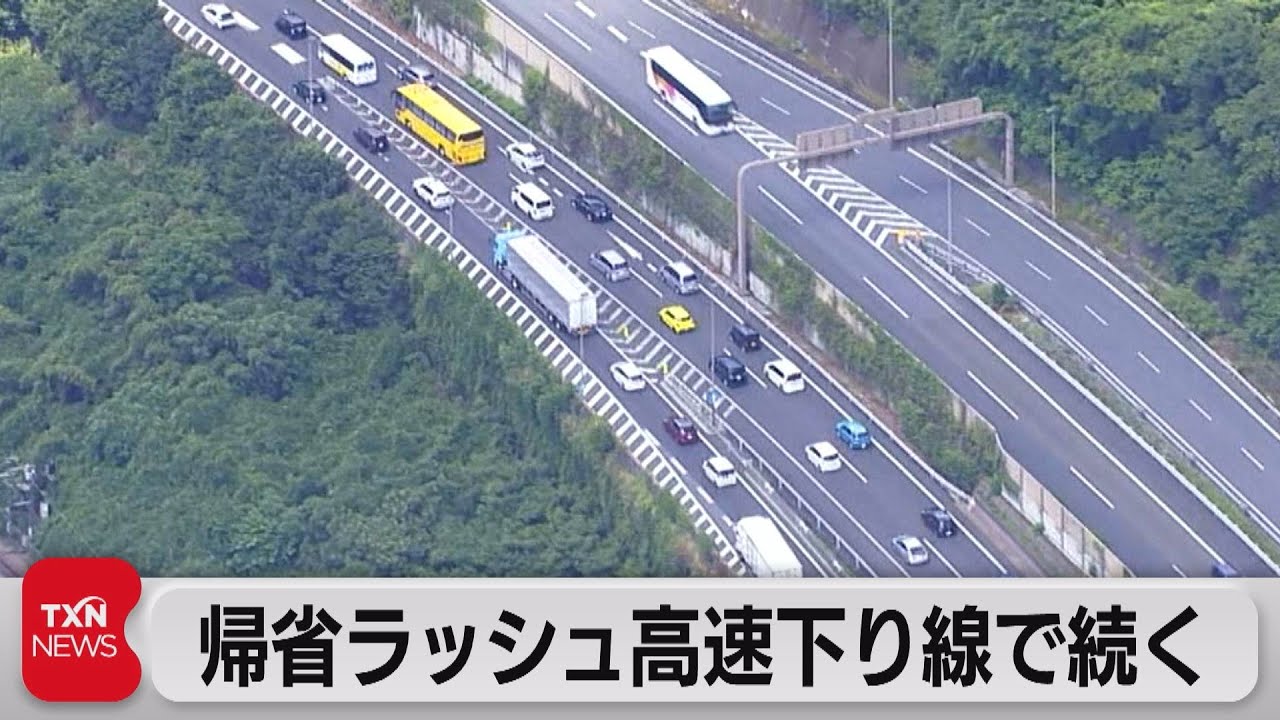 高速道路の下りで渋滞が続いています。3連休中日の12日もお盆を故郷などで過ごす人たちの帰省ラッシュが、高速道路下り線で続いています。午前10時半時点で、中央道で藤野パーキングエリア付近から15キロ、東名高速で海老名サービスエリア付近から17キロ、関越道で高坂サービスエリア付近から15キロの渋滞が発生しています。上りのUターンラッシュは13日がピークになるとみられます。
