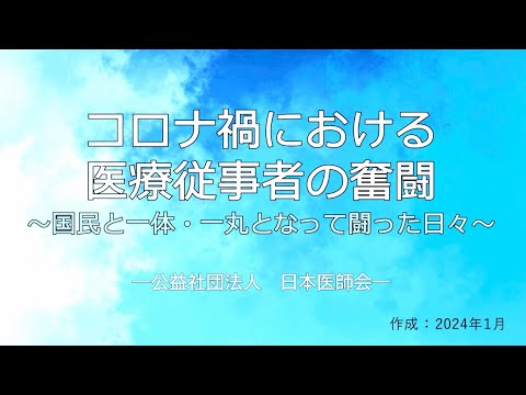 本動画は、日本医師会が医療従事者や国民の皆さんに改めて感謝の意を表すとともに、いつ起こるか分からない新興感染症に対する対策の徹底を呼び掛けるため、全国の医師会や日本医師会の会員から寄せられたコロナ診療の様子を写した写真データの一部を用いて制作したものです。