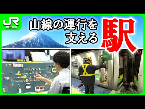 ます作業は列車と列車の舞いで 行い着手終了の都度山線の各駅から っちゃん駅に連絡が来 ます駅社員は作業場所に列車が侵入しない 措置を取り ます えポイント除雪というのはポイントの動く 部分だったりクロッシング部分の雪を 取り除くことを言います動くところに雪が 持ち込んでしまいますと不転換の原因と なりますのでそうならないように要望除雪 をすることで持ち込み行きによる不転換を 防いでるところです踏切りは一般の車も 通るところですので非常に圧接しやすくえ 脱線が起こしやすい箇所になりますえ列車 の車輪は内側がま張っていてえ氷などで そこが乗り上げてしまうと脱線の原因と なってしまいますのでそうならないように フランジウェイを今確保しているところ ですえジョセスパートナーさんはあ今度冬 の間だけ駅の方で雇用させていただいて おります雪の多い日はあ今日のようにえ 普段営業や改札に入ってるような営業の 社員もえ連れてきて一緒に除雪を手伝って もらってい ます 危険ですのでご注意ください山線には 2020年3月のダイヤ改正 で全道で初めてH100型が導入されまし た1日1回行う分割 作業冬はあらゆる場所に雪や降臨が付着し 徐々に時間がかかることもあり [音楽] ますお客様や社員の命に直結するミスは 許されませ ん絶対に事故を起こさないよう基本作業を 徹底してい [音楽] ます 冬はウィンタースポーツを目的としたイン バウンドのお客様で舞うくっちゃん 駅改札機がなくICカードエリア街である ため生産などが生じ改札が混雑し ますえ新空港駅やえ札幌駅また樽駅等と 協力しながらICカードエアと その観のと連携を取りながらまた若手社員 はこの駅に来て英語がペラペラになってい ますえそんなみんなと連携を取りながら 頑張っているところ ですっちゃん駅は今年の10月で120 周年を迎えますえそこに向けてどんどん くっちゃん駅を盛り上げていけたらと思っ てい ます [音楽]