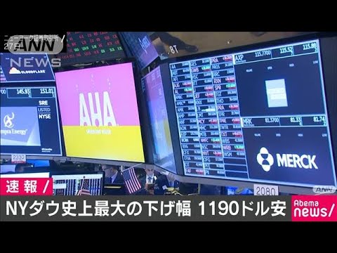 新型コロナウイルスの感染拡大への懸念から、27日のニューヨーク株式市場はダウ平均株価の終値が史上最大の下げ幅となる約1190ドルの値下がりとなりました。