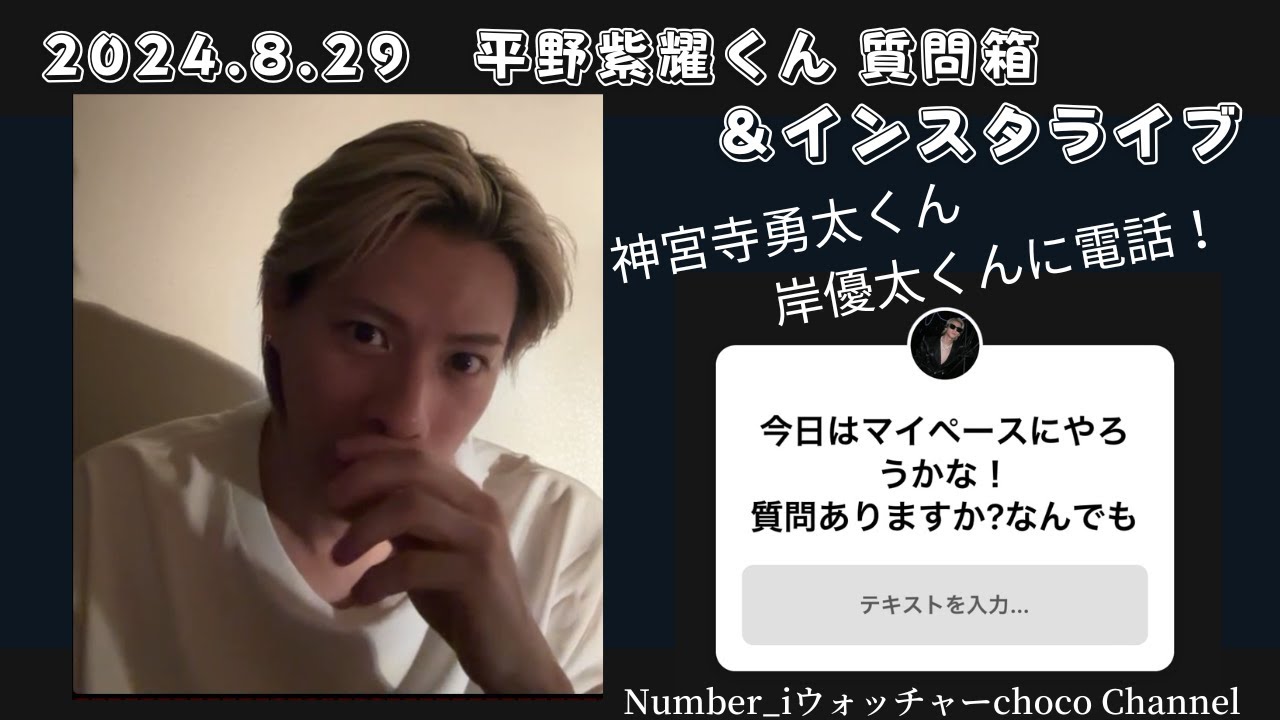 2024.8.29平野紫耀くん質問箱&インスタライブです♪岸優太くん、神宮寺勇太くんに電話しちゃう平野紫耀くん♡ちなみにインスタライブは始めからには間に合わず途中からです、予めご了承くださいませ。
