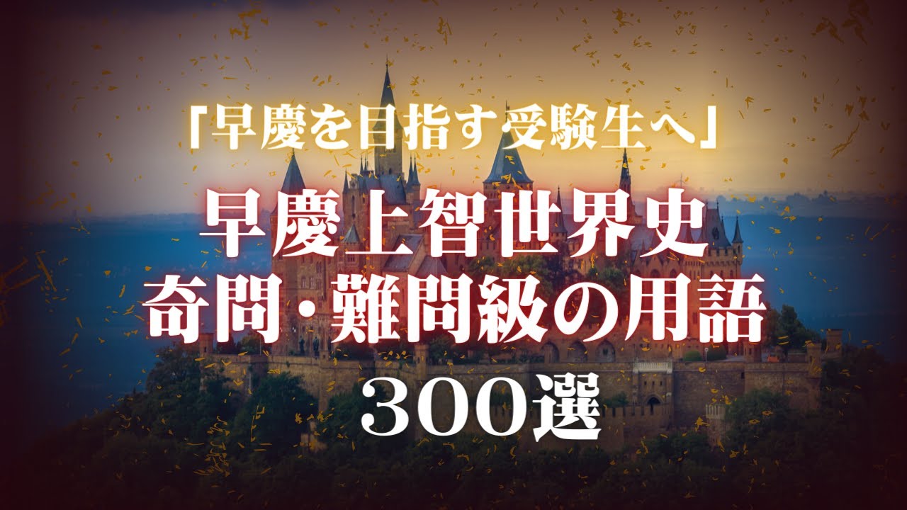 この動画は「ガチでマニアックで、早慶上智にたまに出てくるふざけんなってレベルの用語」のみを僕が独自に300問集めた内の100問です。視聴者の受験生たちからのリクエストがはてしなく多かったので、重い腰を上げて作成しました。もう二度とこの編集したくないってレベルで大変だったので、ぜひ受験の役に立ててください。