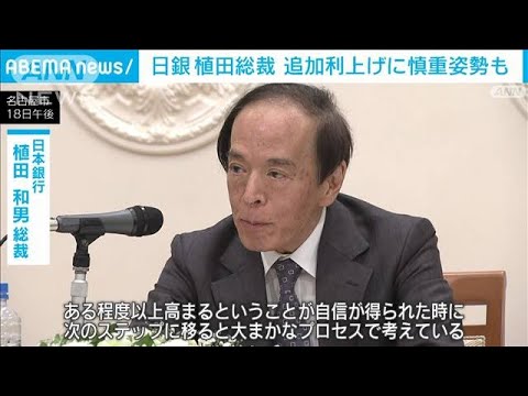 植田総裁は午前中、名古屋で行われた経済団体などとの懇談で、「経済や物価の改善に併せて金融緩和の度合いを少しずつ調整していくことは息の長い成長を支える」と、追加利上げの意義を強調しました。