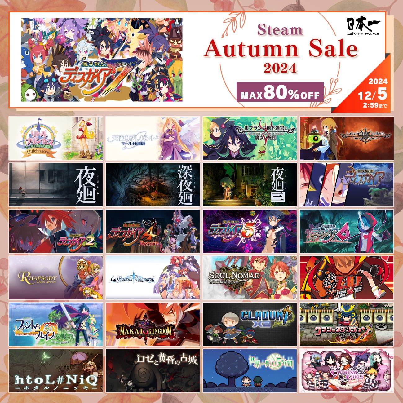 日本一ソフトウェアは、PCゲーム配信プラットフォームSteamにて、同社タイトルのセールを11月28日から12月5日2時59分まで開催している。
