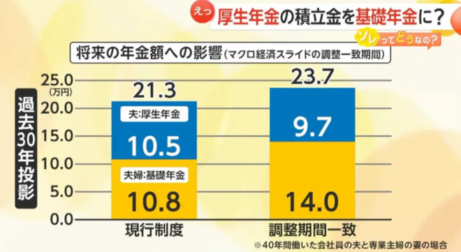 厚生年金のマクロスライドは2026年に終わる予定だったが、その資金を基礎年金にまわし、2036年まで延長する(つまり減額する)ことが今回の改正のポイントである。この調整期間一致によって年金は月額21.3万円から23.7万円に増える予定だが、2階部分の厚生年金は10.5万円から9.7万円に減る。