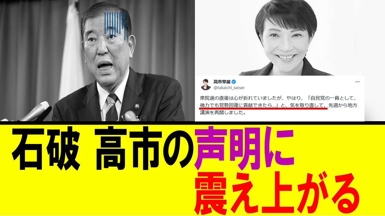 『高市さんは自民を抜けるべき』『新党を立ち上げるべき』『国民民主党へ行くべき』等の意見も見られるけど…自民再建が1番重要…今離党したら総裁から遠退くだけ。閣下が後ろ楯になってくれたし。