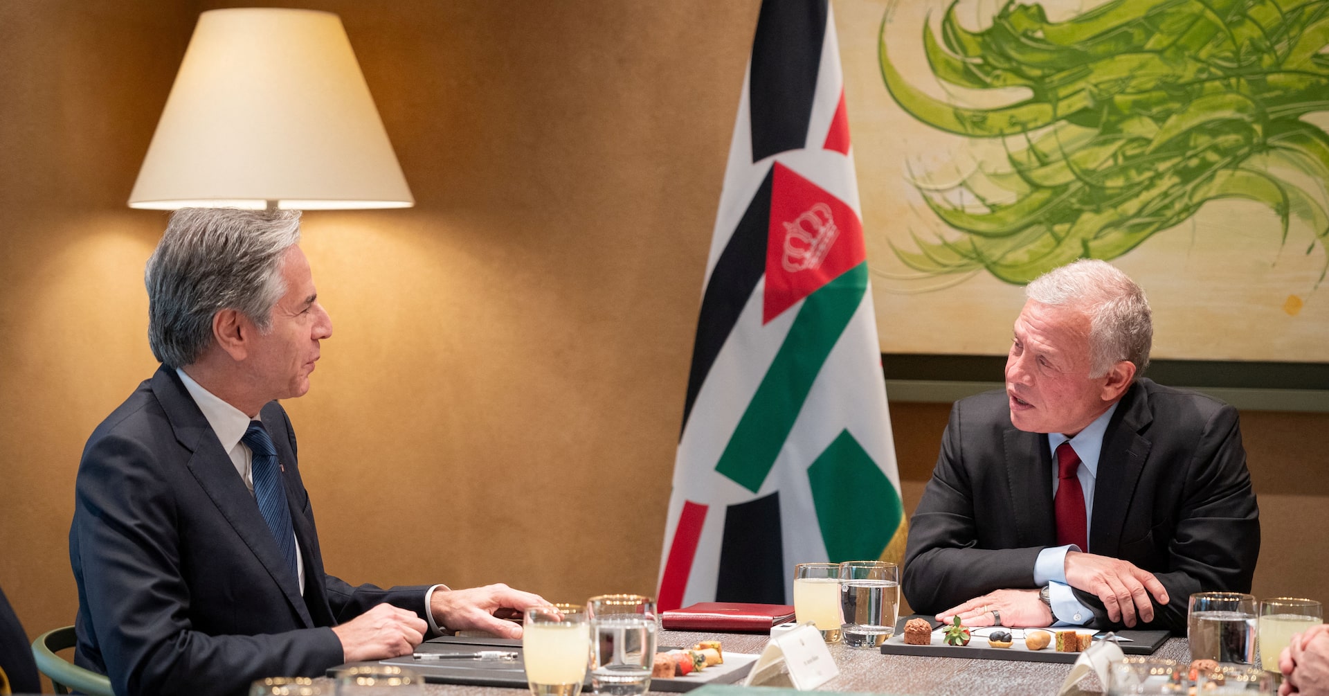 ブリンケン米国務長官(左)は12日、ヨルダンのアブドラ国王(右)と会談した。同日撮影(2024年 ロイター/Jordanian Royal Court/Handout via REUTERS)